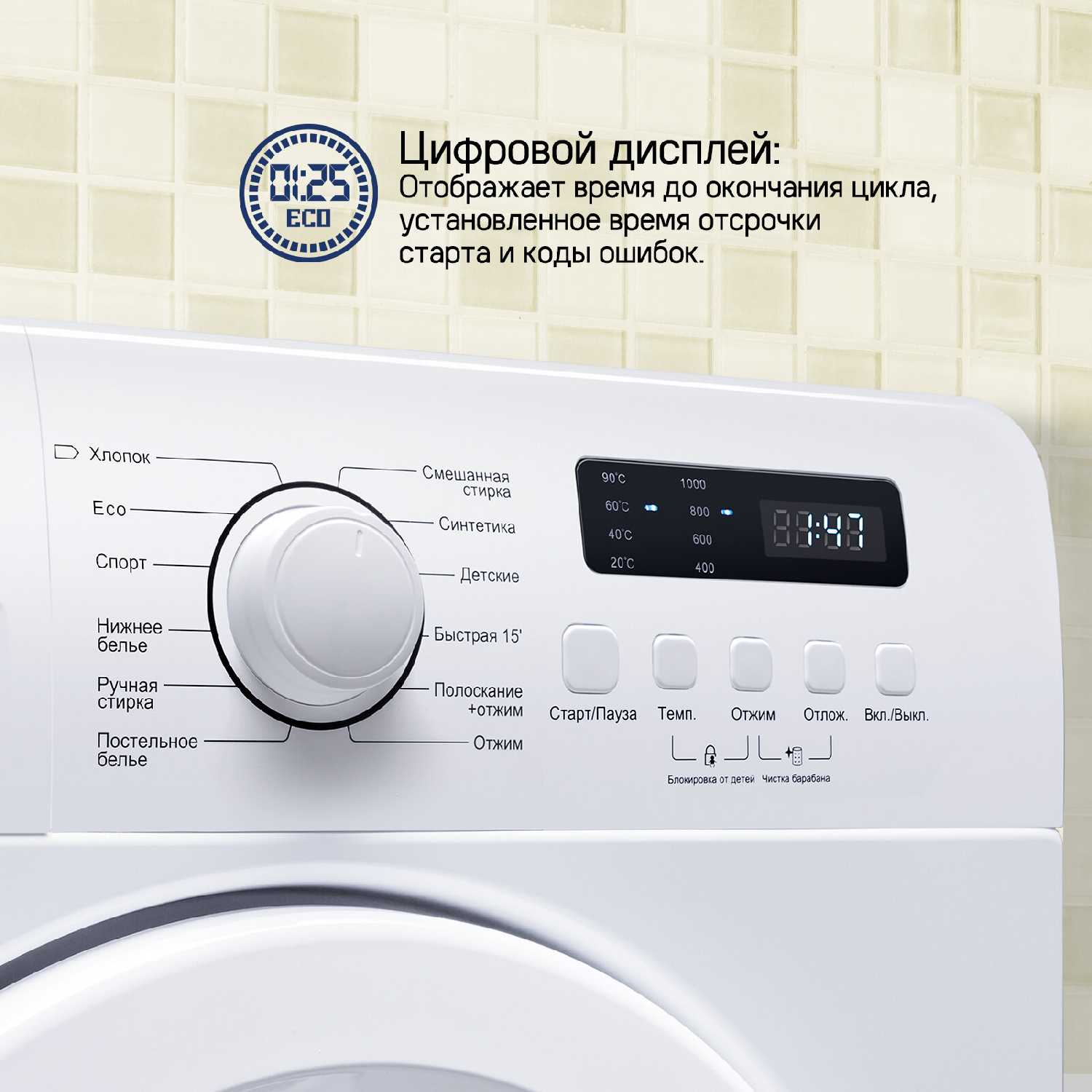 - Интуитивная панель управления на русском языке с цифровым дисплеем упрощает выбор программ и отслеживание оставшегося времени.