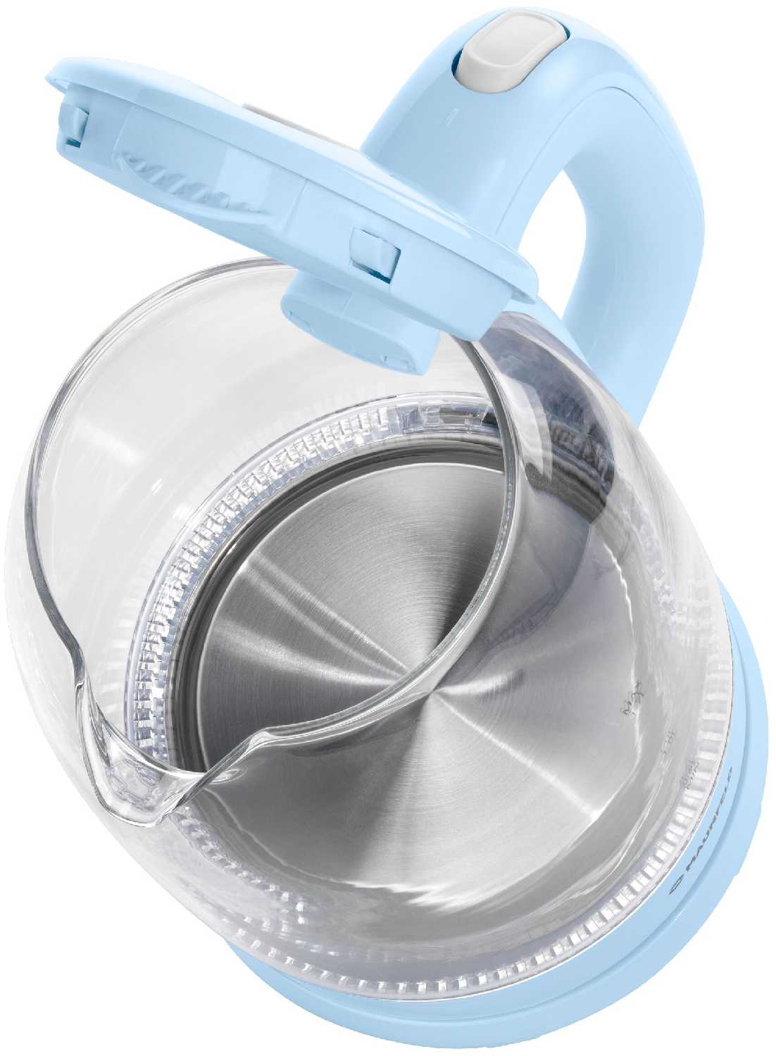- Прозрачный корпус из закалённого стекла позволяет наблюдать за процессом кипячения и своевременно очищать накипь.