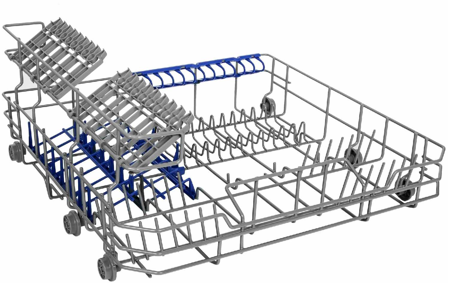 Верхняя корзина адаптирована для чашек и бокалов с регулируемыми держателями, нижняя — для крупных предметов вроде сковородок. Съемные складные элементы позволяют освободить место для высоких кастрюль. Единственный нюанс — небольшой размер контейнера для столовых приборов, который может быть неудобен для больших наборов. -