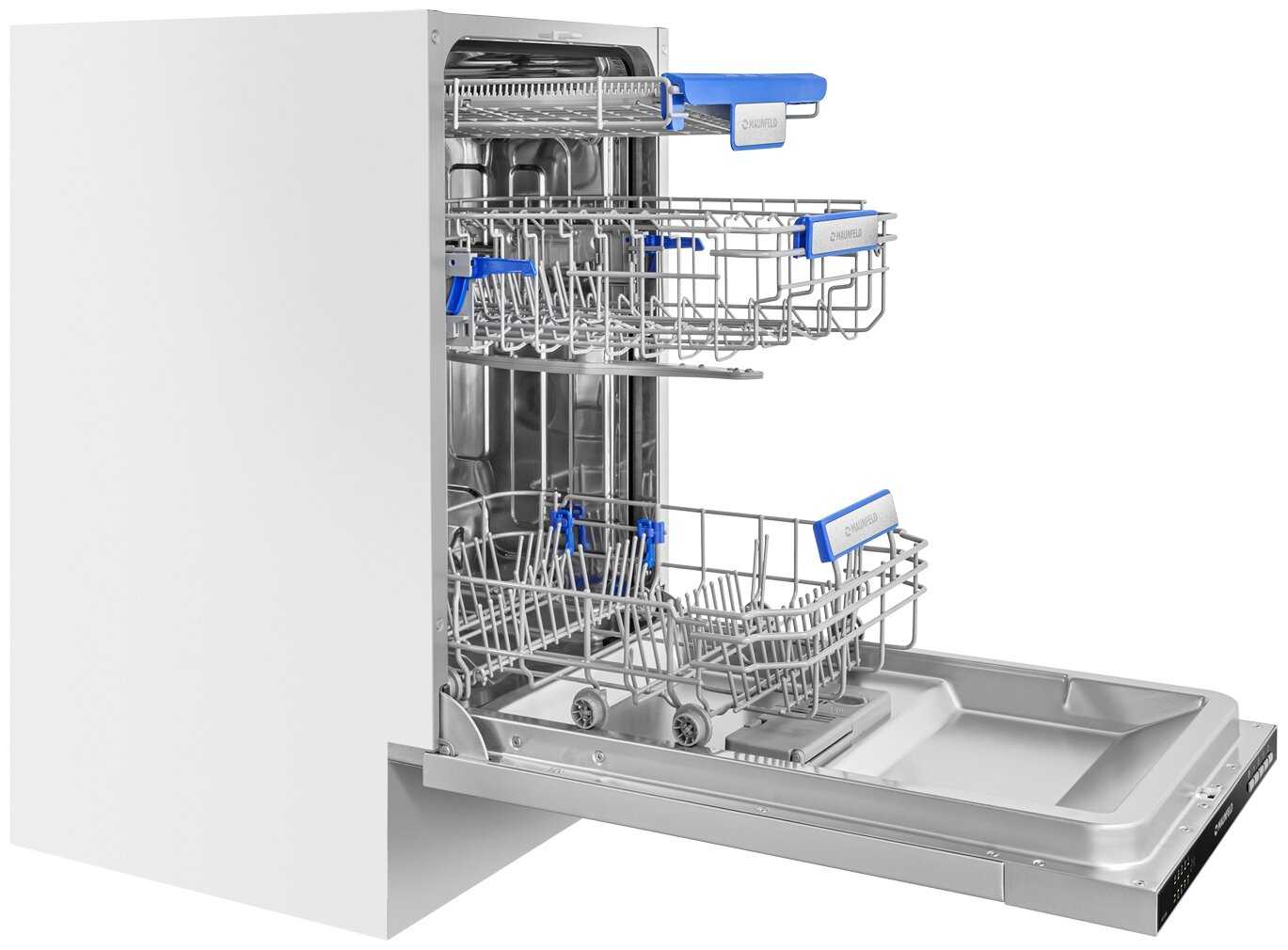 Посудомойка имеет стандартные размеры, поэтому она отлично подошла в мою встраиваемую кухню. На крышке имеются все функции мытья. При этом, в работе она не шумная. Корзин несколько, поэтому можно сразу помыть несколько комплектов посуды. Расход воды 7 литров за цикл, потребляется мощность около 2 киловат