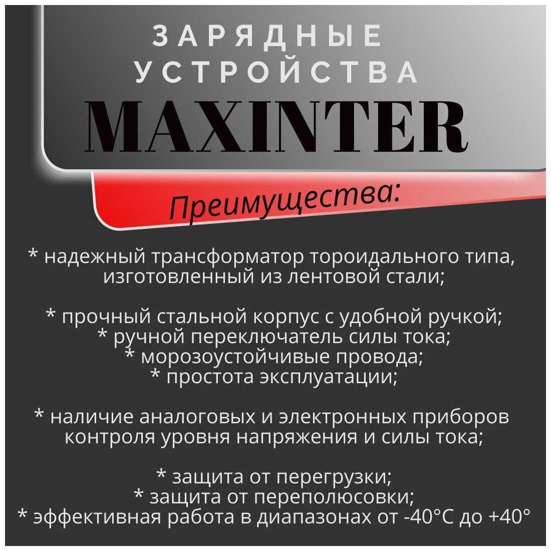 | Подробная комплектация : | - зарядное устройство для АКБ MAXINTER PLUS -20CT - 1 шт, - паспорт изделия - 1 шт, - упаковка |