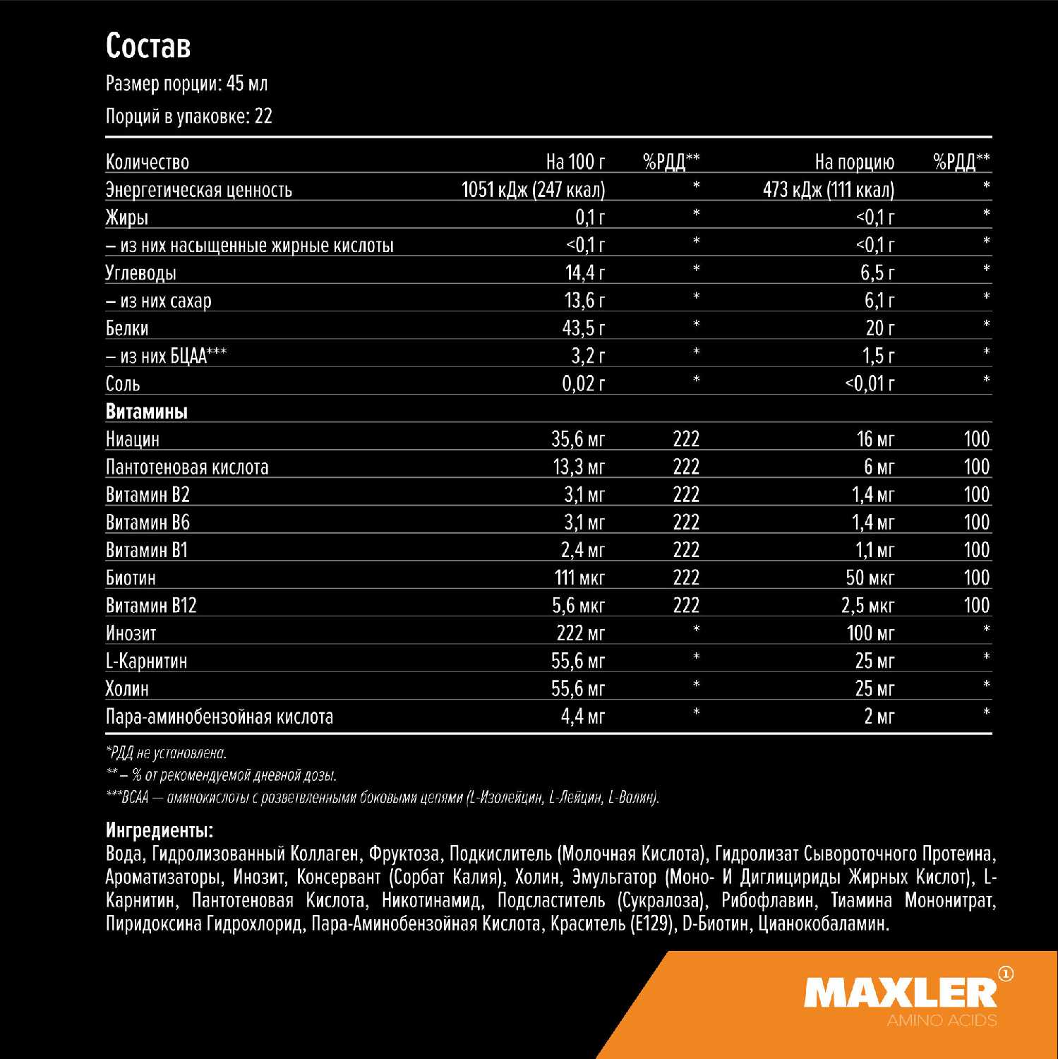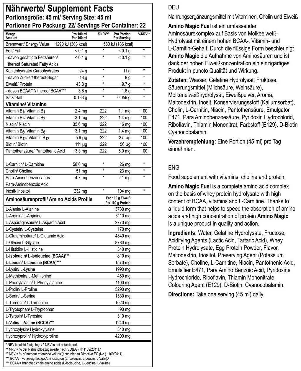 Дополнительная информация : | 22 порции, размер порции в г(мл): 45, назначение: стимулирует обмен веществ и восстановительные процессы, рекомендации по применению: одна порция Amino Magic Fuel составляет 45 мл (2 мерных колпачка), принимайте одну порцию в день, состав: вода гидролизат желатина фруктоза подкислители (молочная кислота винная кислота) гидролизат сывороточного протеина сухой яичный белок ароматизатор мальтодекстрин инозит консервант (сорбат калия) холин l-карнитин ниацин пантотеновая кислота эмульгатор е471 парааминобензойная кислота гидрохлорид пиридоксина рибофлавин мононитрат тиамина пищевой краситель e129 d-биотин цианокобаламин |
