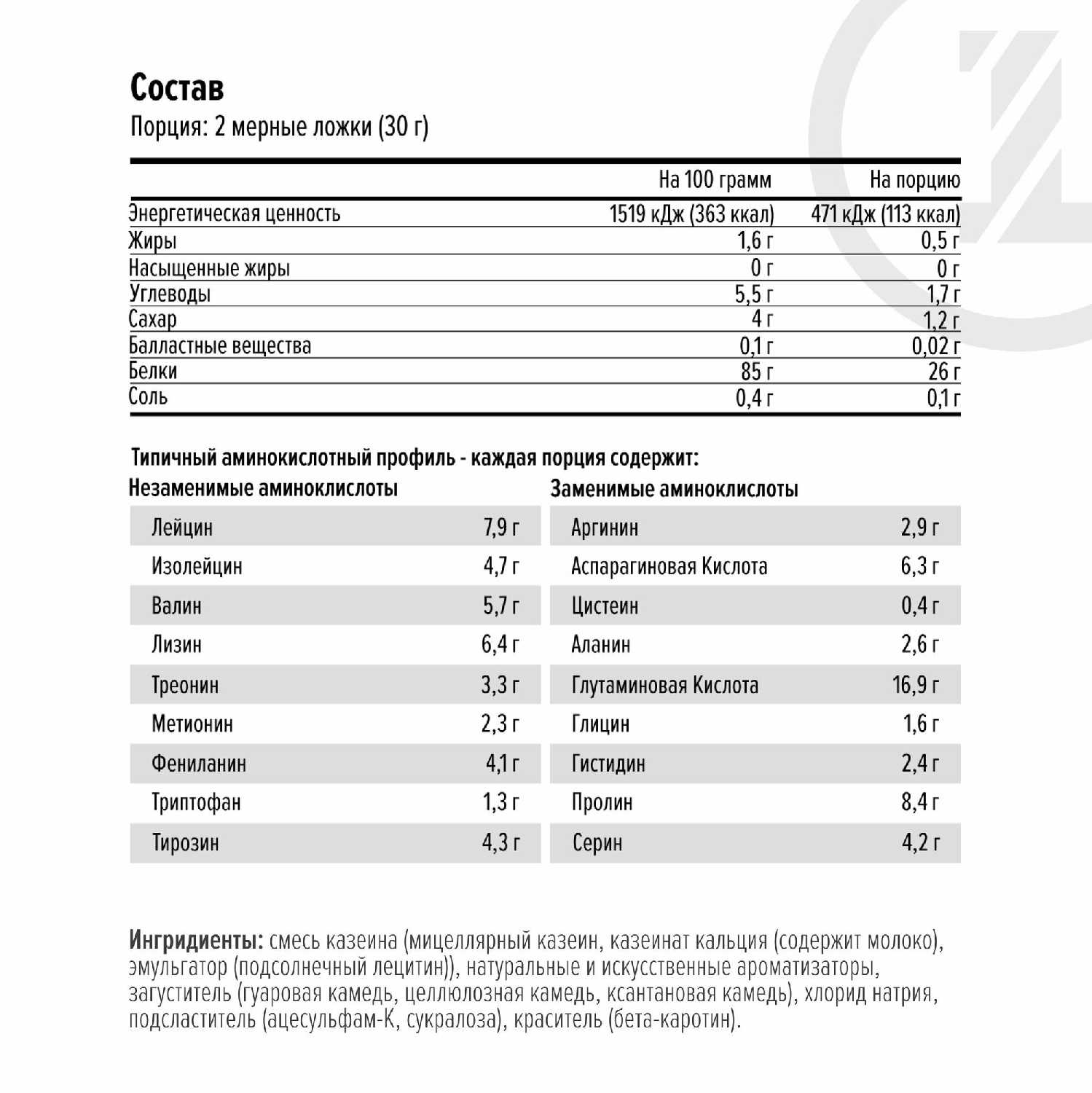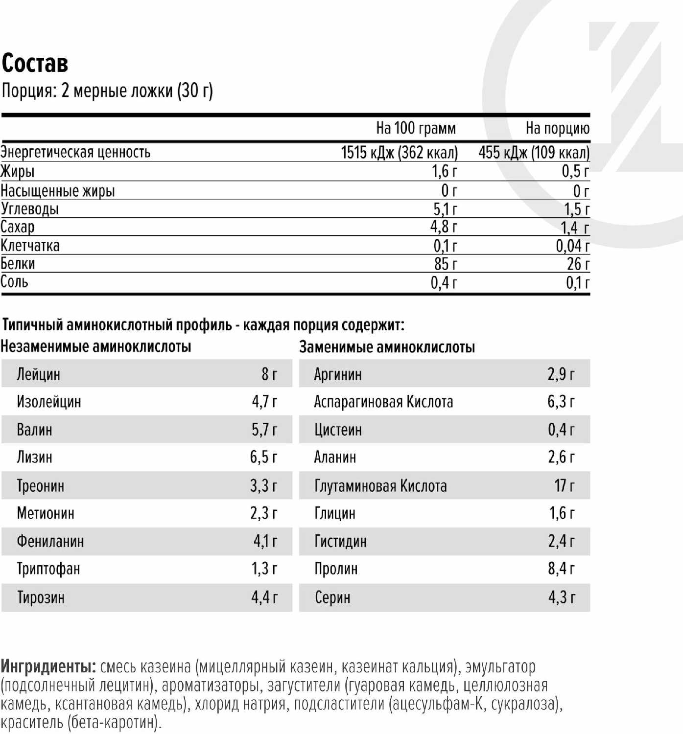 | Тип протеина : | молочный, многокомпонентный, казеин |