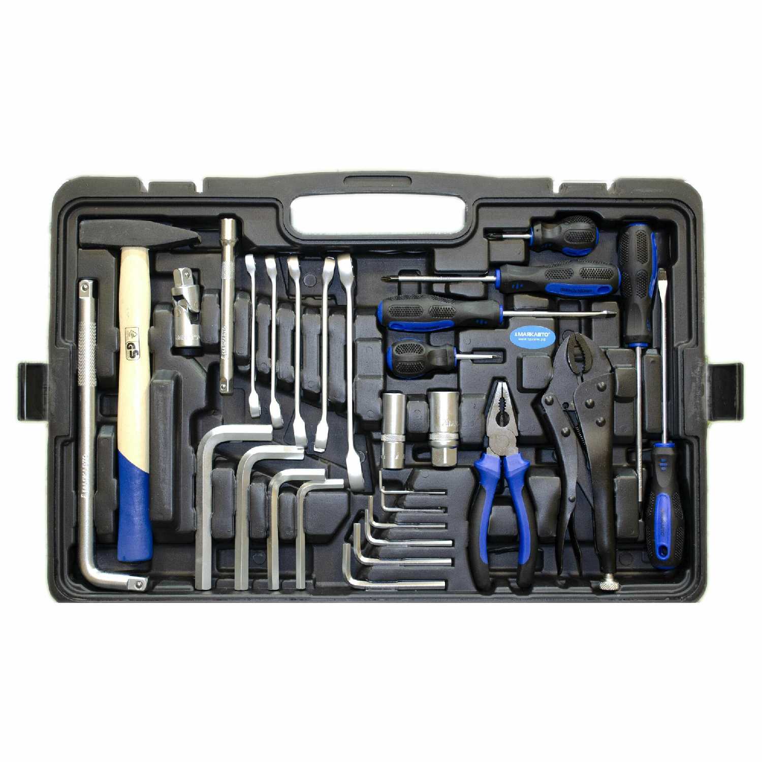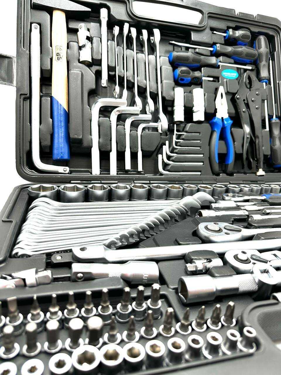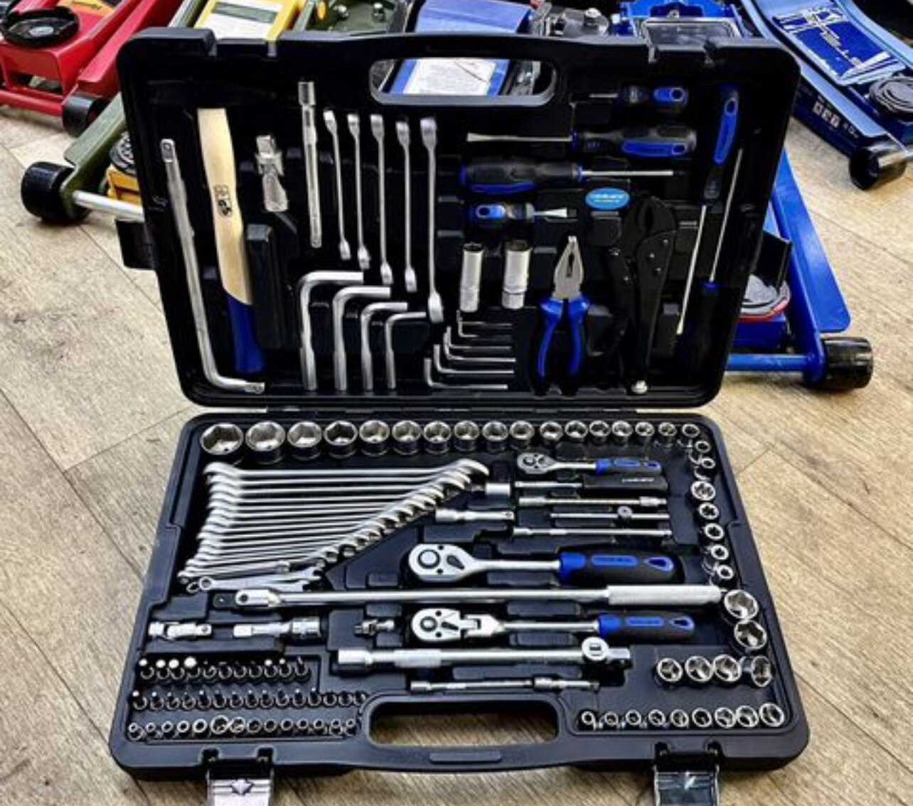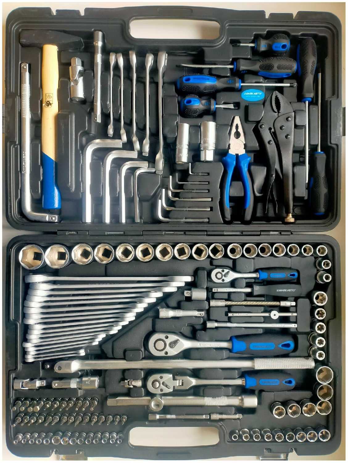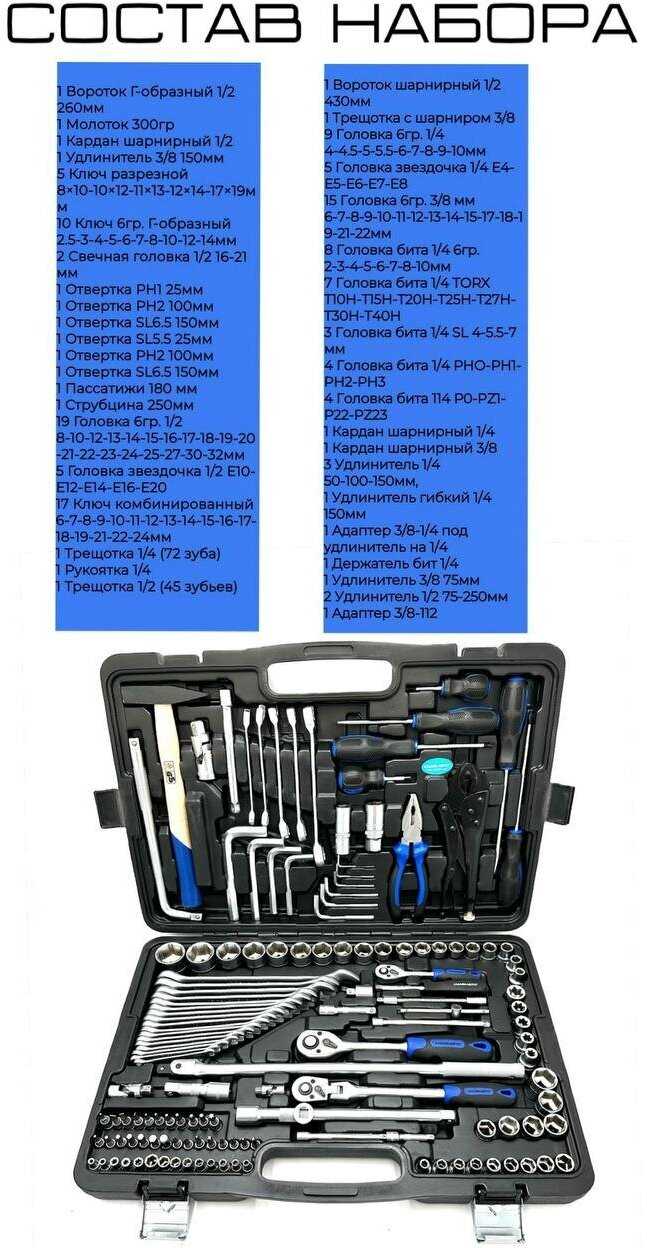 Инструменты в комплекте : | вороток для головок, клещи, ключ переставной гаечный, ключи гаечные, ключи имбусовые (шестигранные), ключи торцевые, кусачки, молоток, отвёртки, отвёртки для точных работ, пассатижи, плоскогубцы, разрезные ключи-насадки, рукоять для бит, рукоять для головок, струбцина, трещотка |