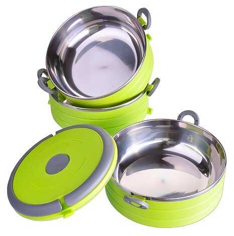 - + Лёгкий, достаточно большой объём еды, есть ручки для переноски, три тарелки, компактный внешний размер, неплохое качество.
