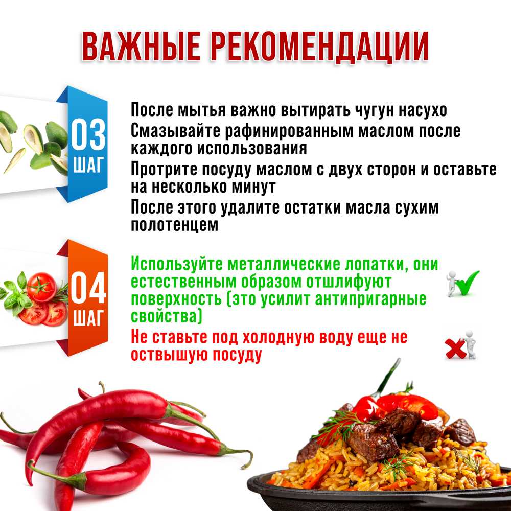 - Чугун впитывает odors от блюд, как лагман или плов, вызывая стойкий запах, который не выветривается после мытья.