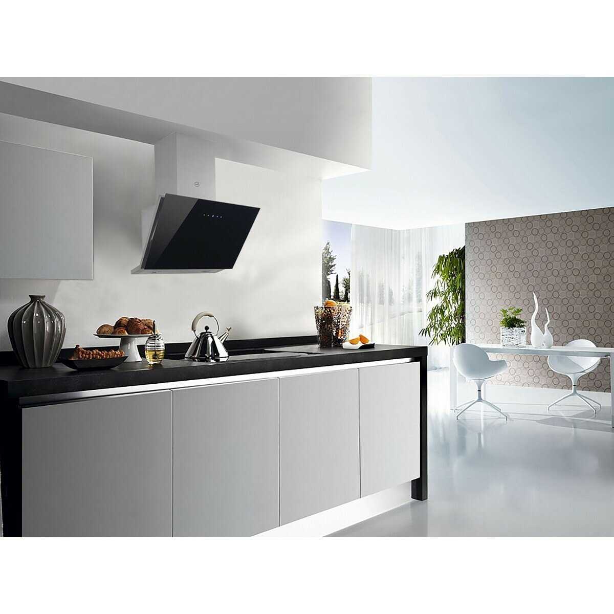 Вытяжка выглядит очень монументально, практически парящий айсберг над варочной поверхность плиты. Роскошно смотрится на кухне, выполненной в современном стиле. Вытяжка сделана из металла и высококачественного прочного стекла. Стекло хорошо очищается специализированными моющими средствами.