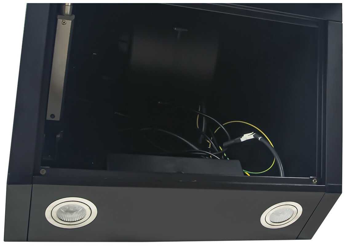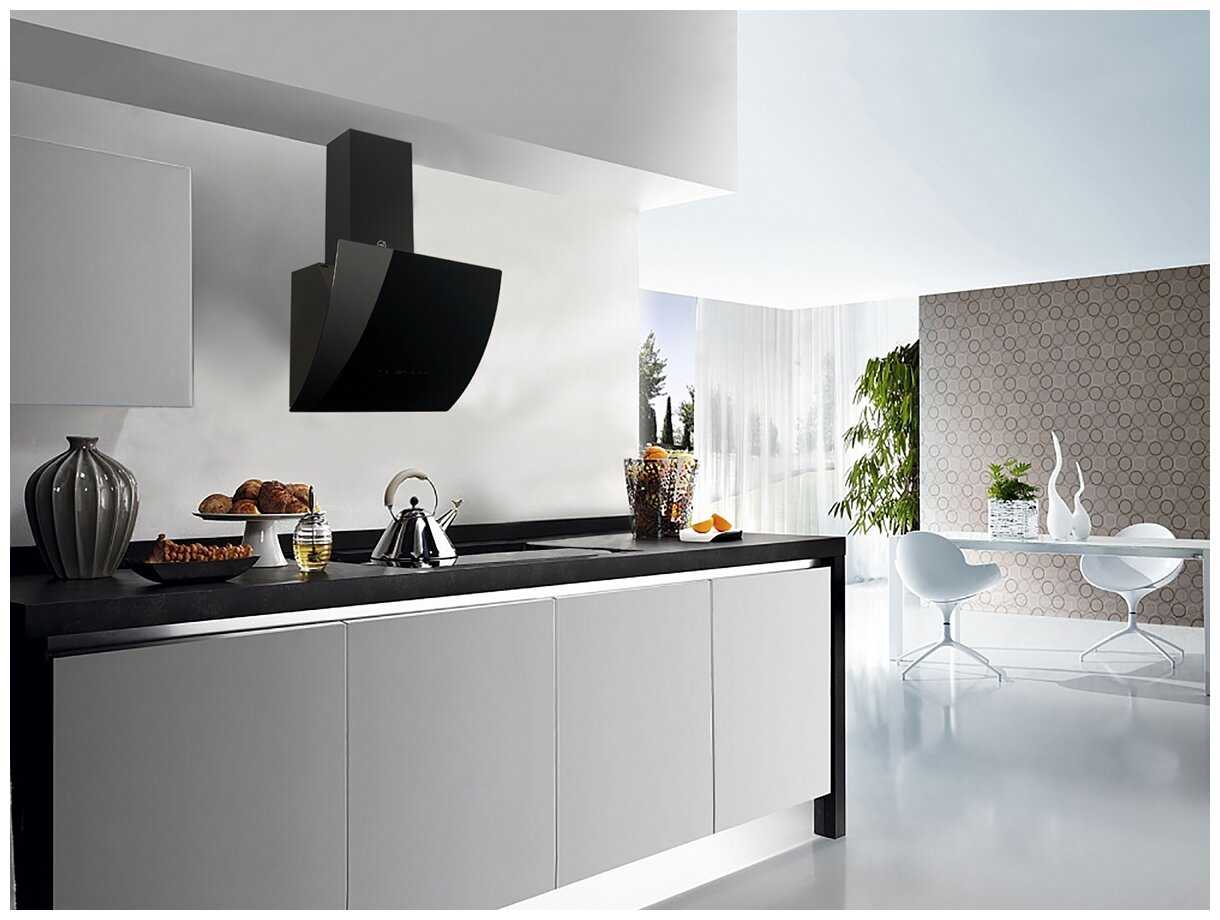 Модель выполнена в универсальном черном цвете прекрасно гармонирующему с современной кухней. Кроме того, у этой вытяжки очень оригинальный дизайн. Сделана вытяжка из термостойкого стекла. У вытяжки есть два режима работы. Ест встроенная светодиодная подсветка. У этой вытяжки низкий уровень шума при очень мощном моторе.