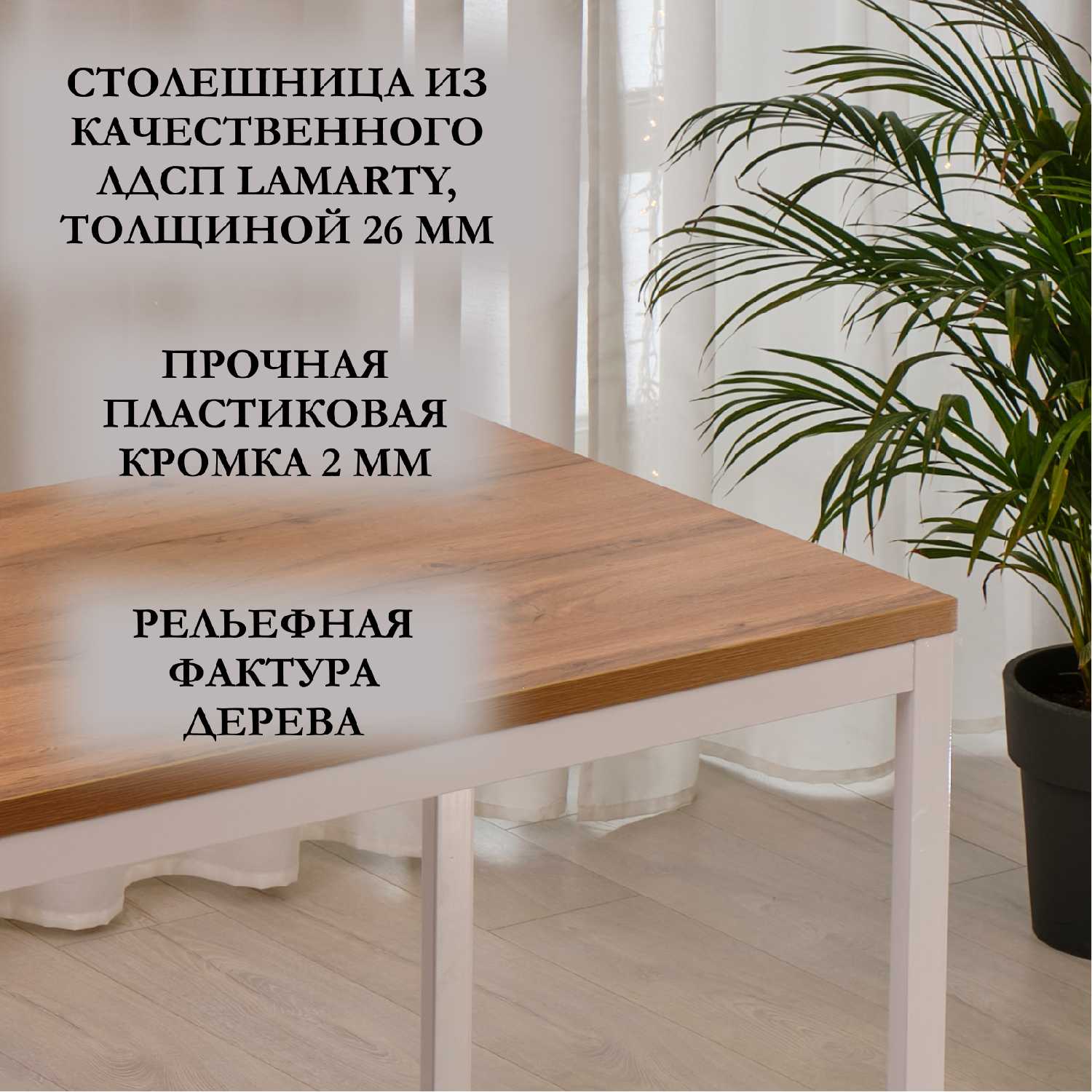 - Сочетание матовой столешницы (имитация дуба или однотонные цвета) и глянцевых металлических ножек создает современный и стильный визуальный образ.