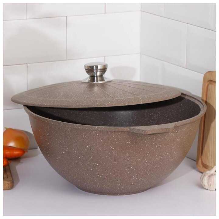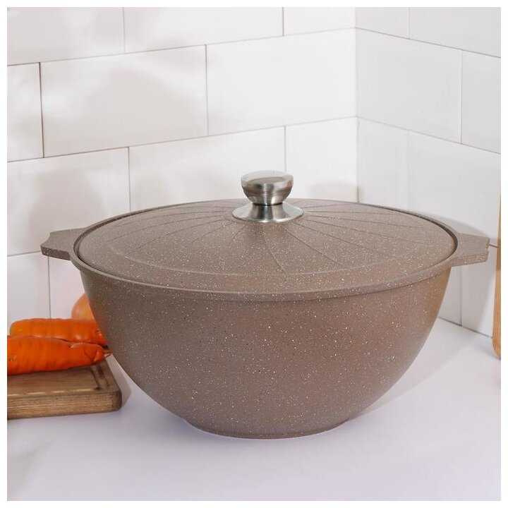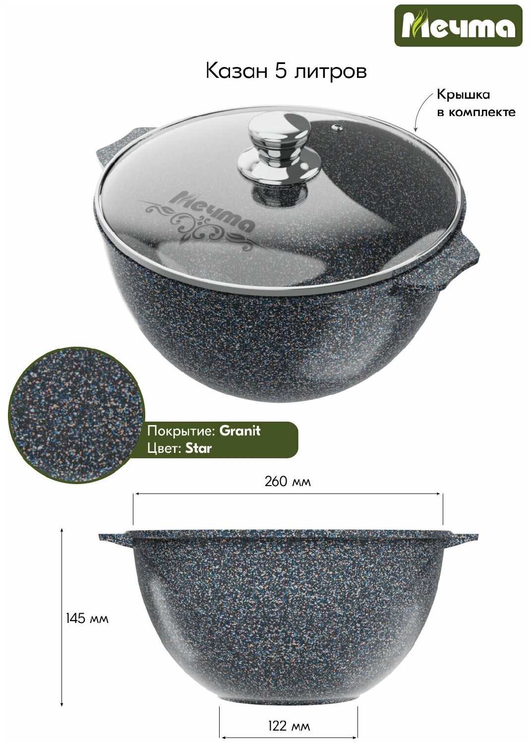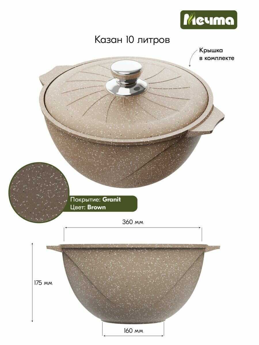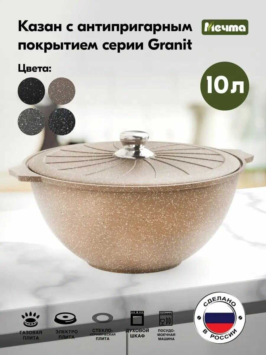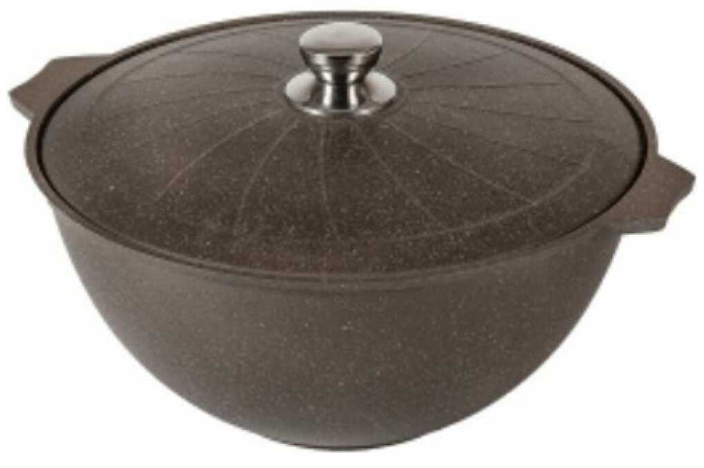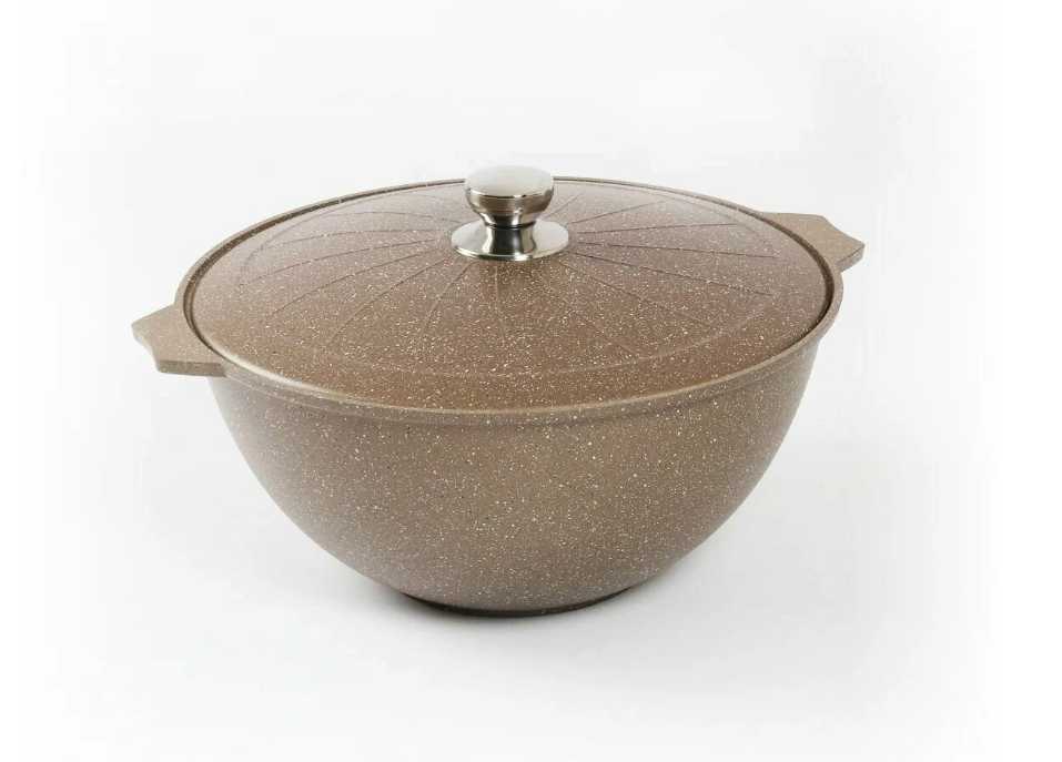 Казан изготовлен из алюминия с многослойным антипригарным покрытием, а не из чугуна или гранита. Это обеспечивает легкость (1.5–2 кг против 5+ кг у чугуна), но снижает теплоемкость. Для защиты покрытия рекомендуется использовать деревянные или силиконовые лопатки. -