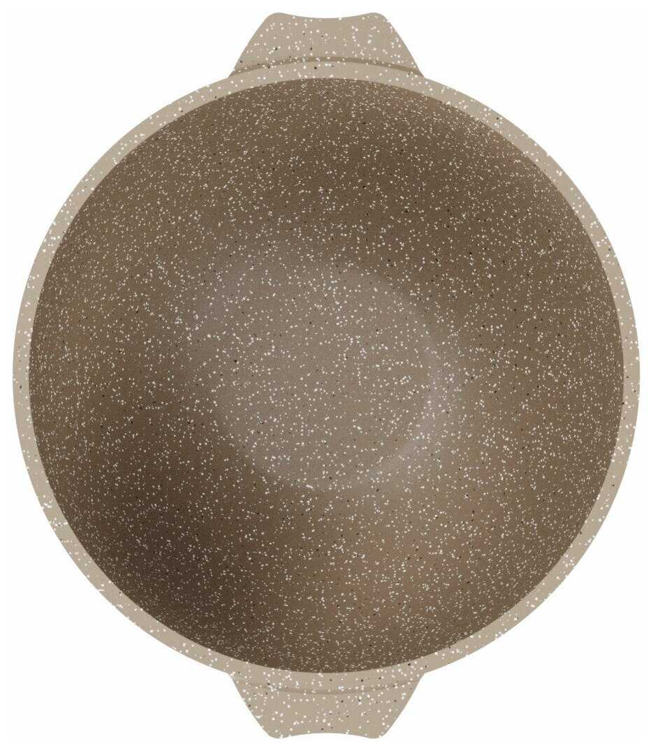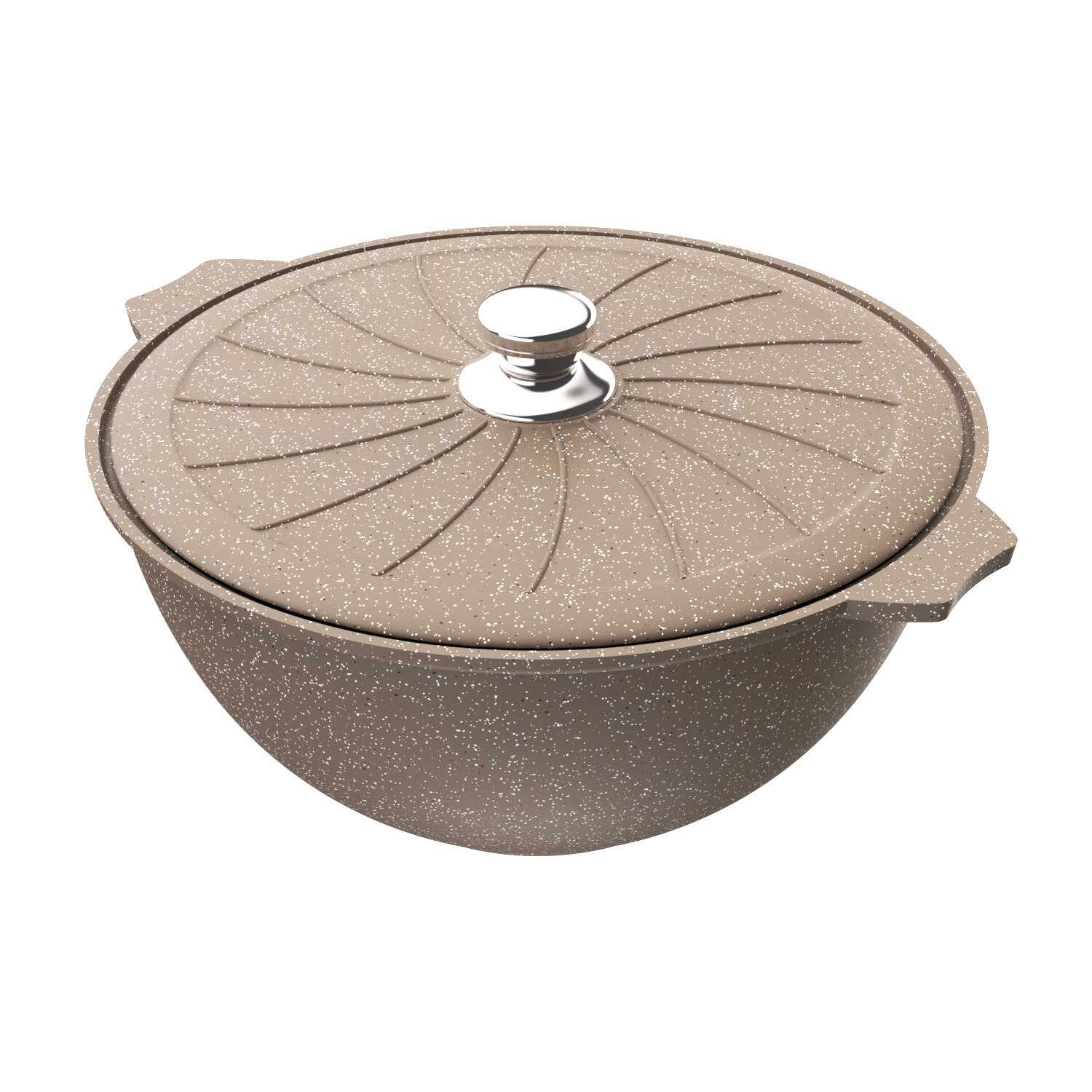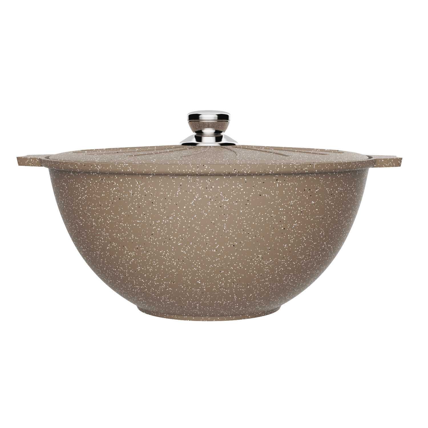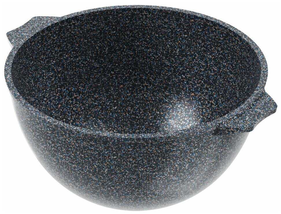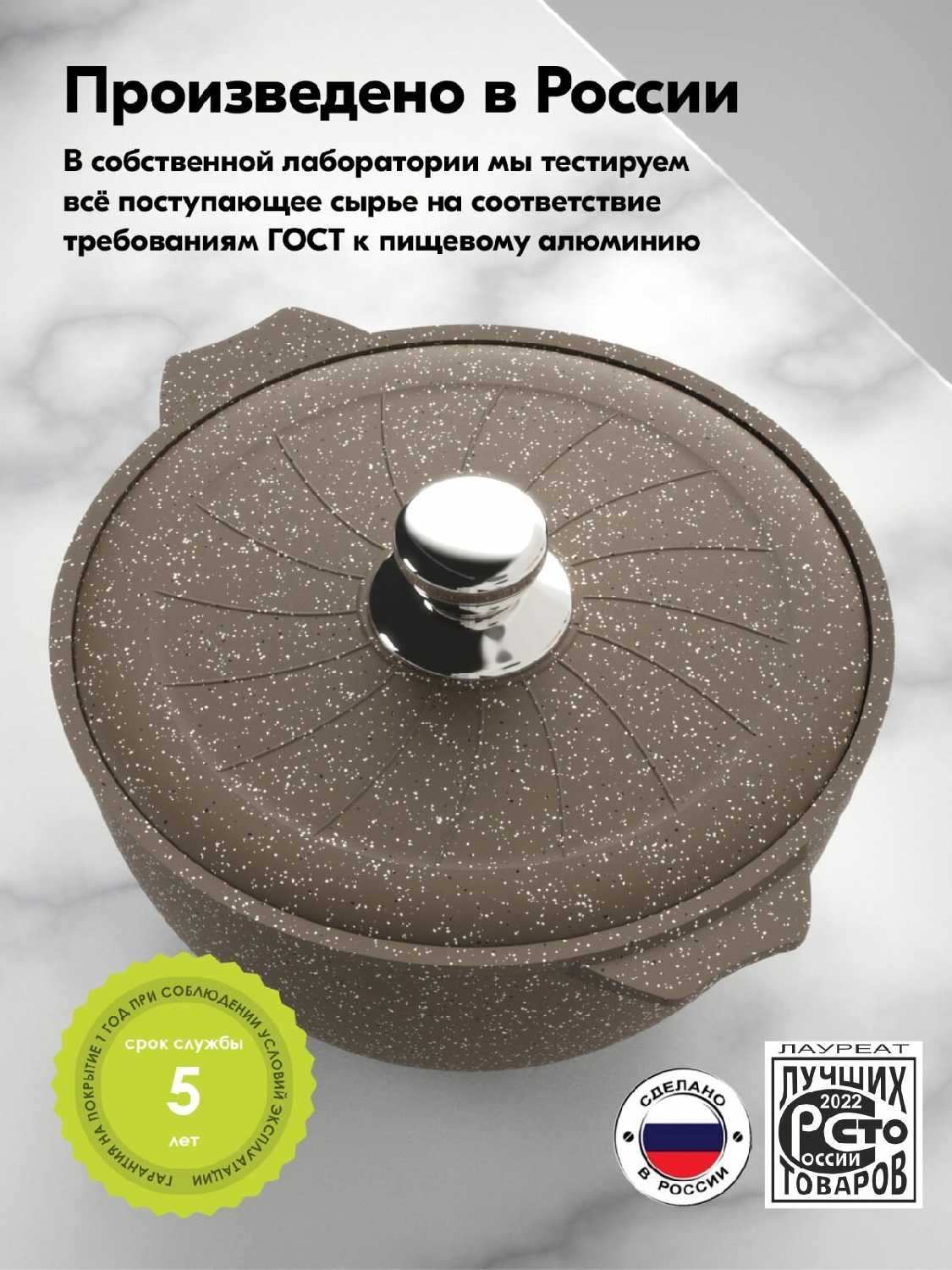 Казан изготовлен из алюминия с многослойным антипригарным покрытием, а не из чугуна или гранита. Это обеспечивает легкость (1.5–2 кг против 5+ кг у чугуна), но снижает теплоемкость. Для защиты покрытия рекомендуется использовать деревянные или силиконовые лопатки. -