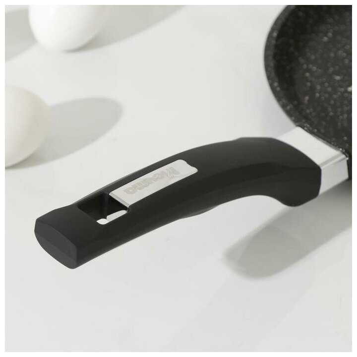 Толстое дно (5–7 мм) — ключевая особенность: оно аккумулирует тепло, предотвращая локальный перегрев и обеспечивая стабильную температуру по всей поверхности. В отзывах многократно подчёркивается, что это исключает подгорание и гарантирует, что блины пропекаются равномерно, без «сырых» пятен. Такая конструкция также минимизирует деформацию при резких перепадах температур, например, при охлаждении водой. -