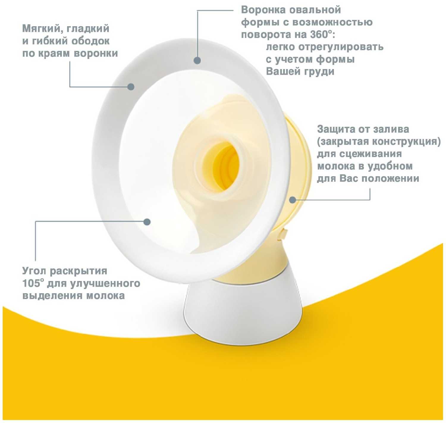 - Гибкие силиконовые воронки разных размеров (S и L) хорошо прилегают к груди, позволяя сцеживать в полулежачем положении без необходимости сидеть прямо (положительно отмечено в отзывах о комфорте).
