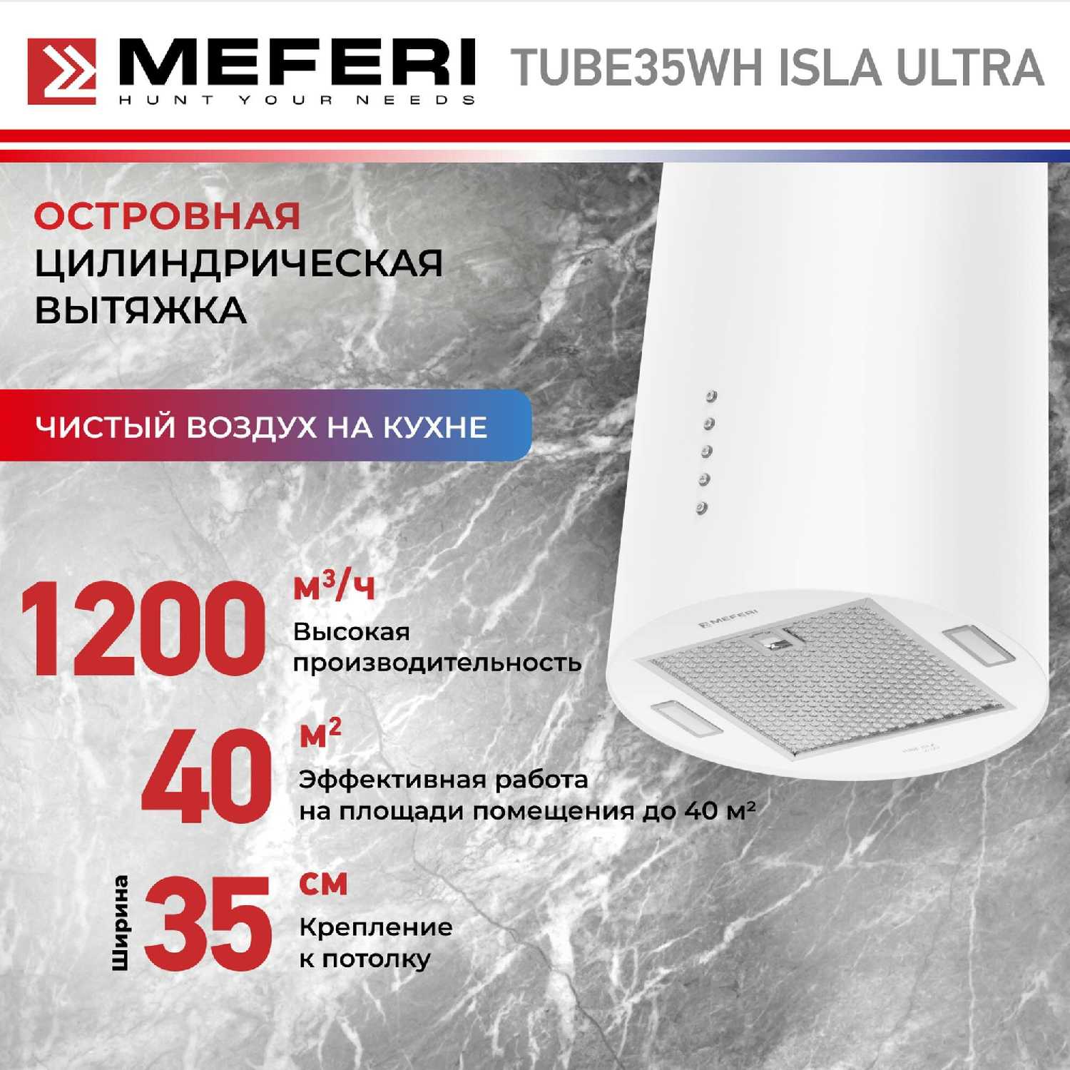 Отзывы о Цилиндрическая островная вытяжка MEFERI TUBE35WH ISLA ULTRA