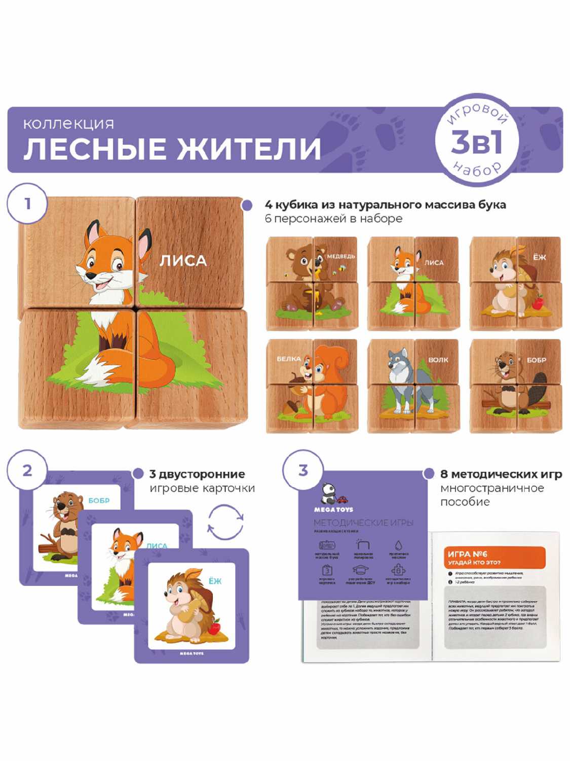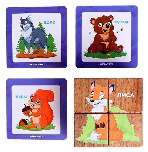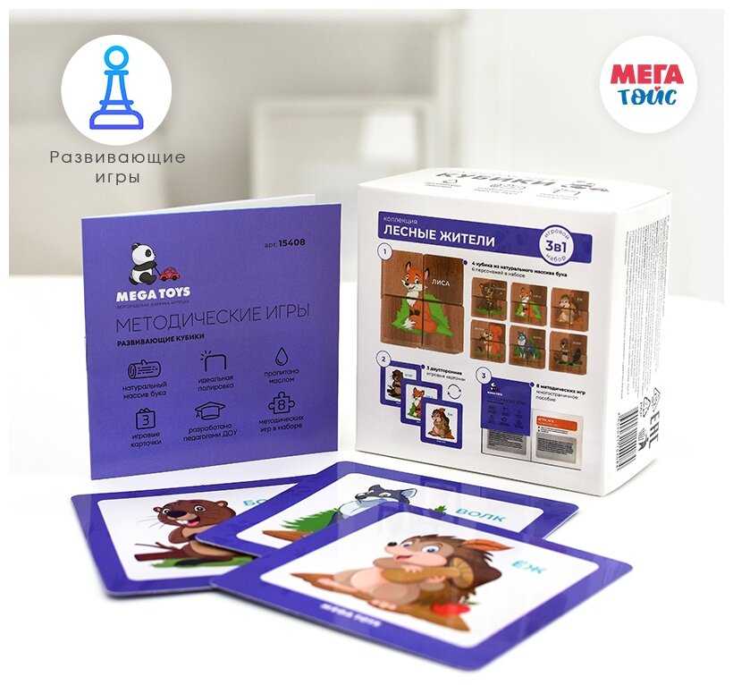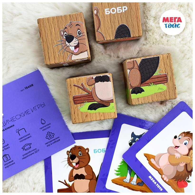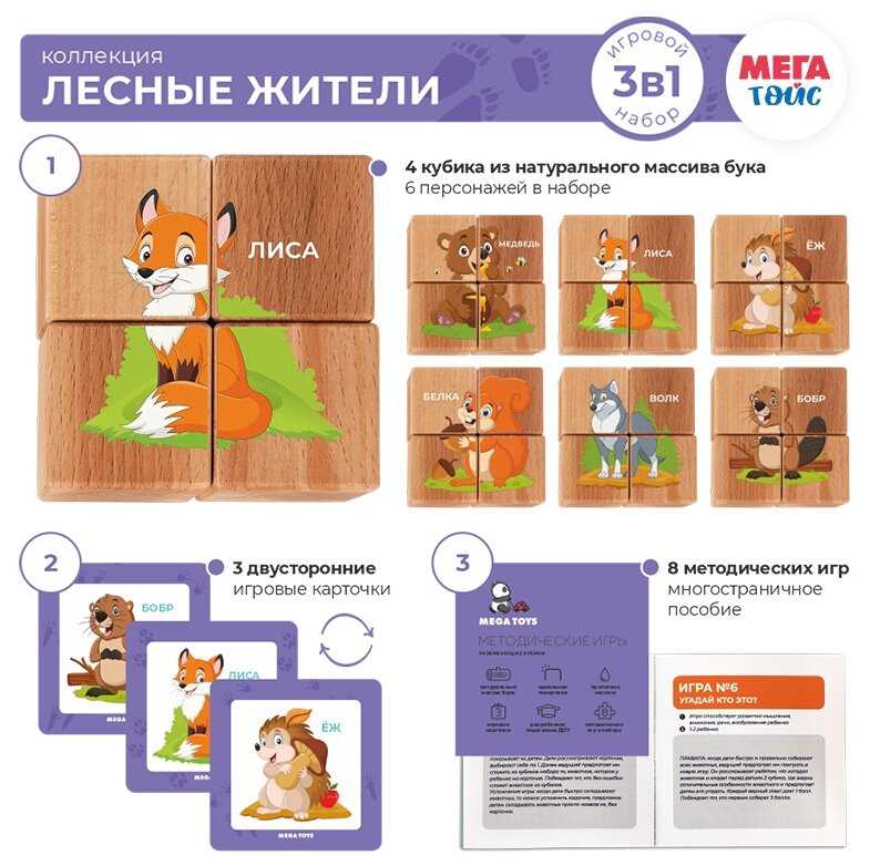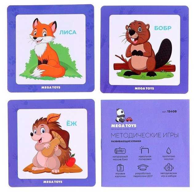 Дополнительная информация : | в наборе: 4 кубика с изображением 6 животных, 3 двухсторонних карточки, обучающее методическое пособие |