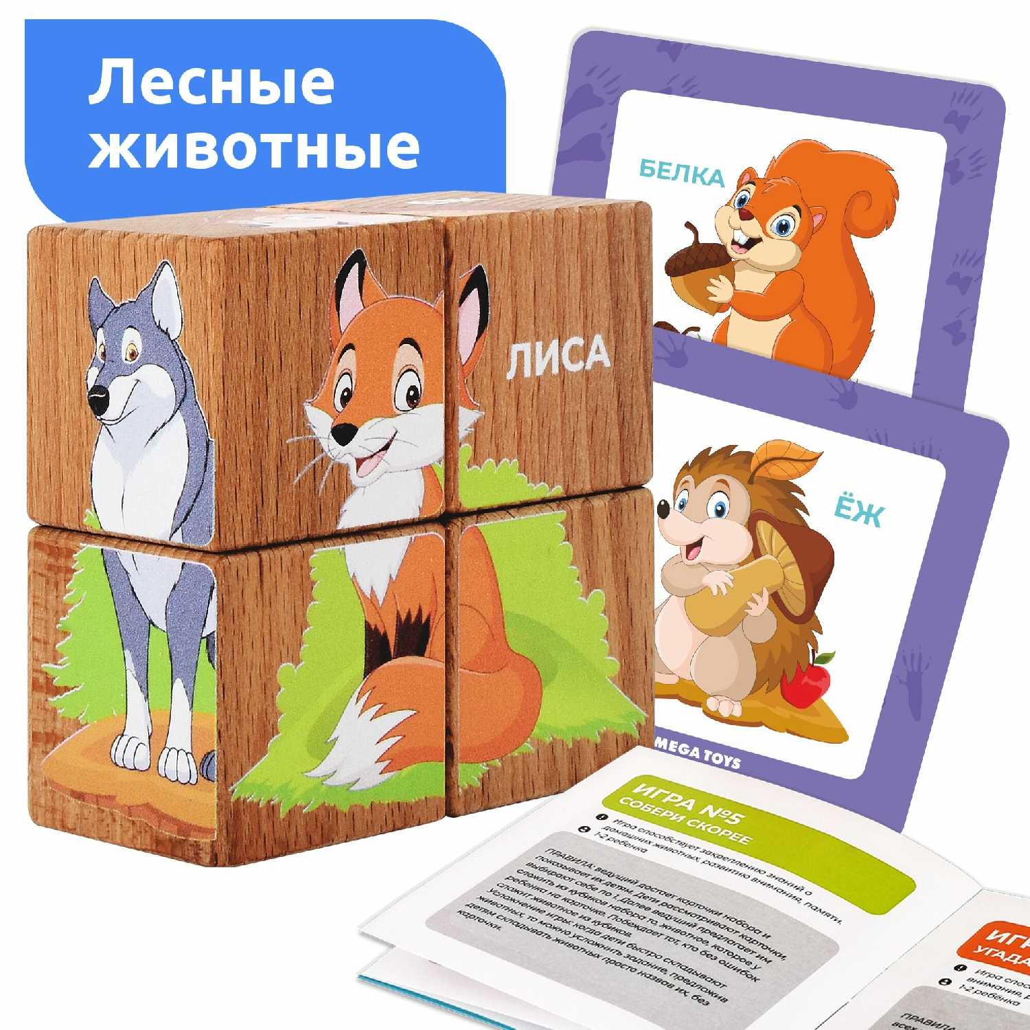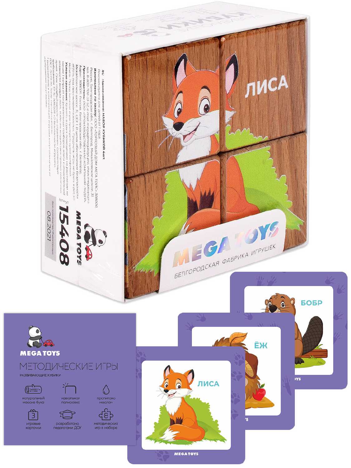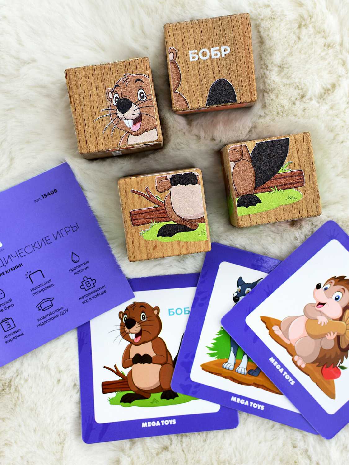 Дополнительная информация : | в наборе: 4 кубика с изображением 6 животных, 3 двухсторонних карточки, обучающее методическое пособие |