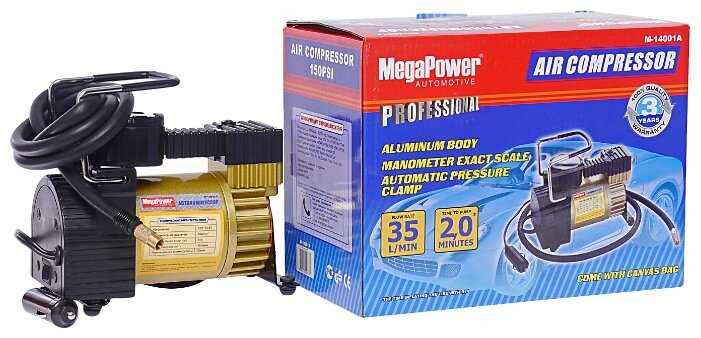 | Подробная комплектация : | Компрессор автомобильный поршневой (автомобильный насос с автоматическим фиксатором давления в сумке), 35 л/ мин, 14А MEGAPOWER 150PSI M-14001A |