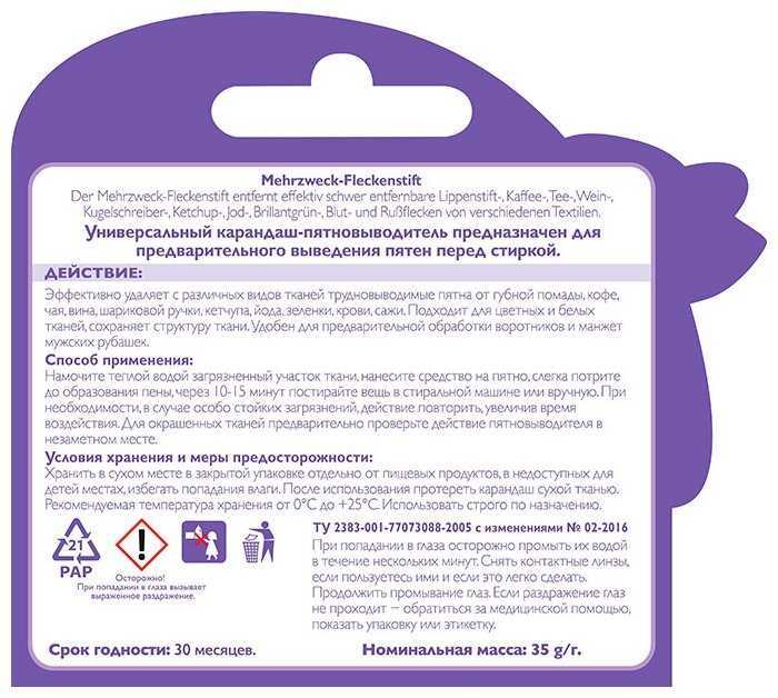 | Способ применения : | Намочите теплой водой загрязненный участок ткани, нанесите средство на пятно, слегка потрите до образования пены, через 10-15 минут постирайте вещь в стиральной машине или вручную. После использования протрите карандаш сухой тканью. При необходимости, в случае особо стойких загрязнений, действие повторите, увеличив время воздействия. Для окрашенных тканей предварительно проверьте действие пятновыводителя в незаметном месте. |