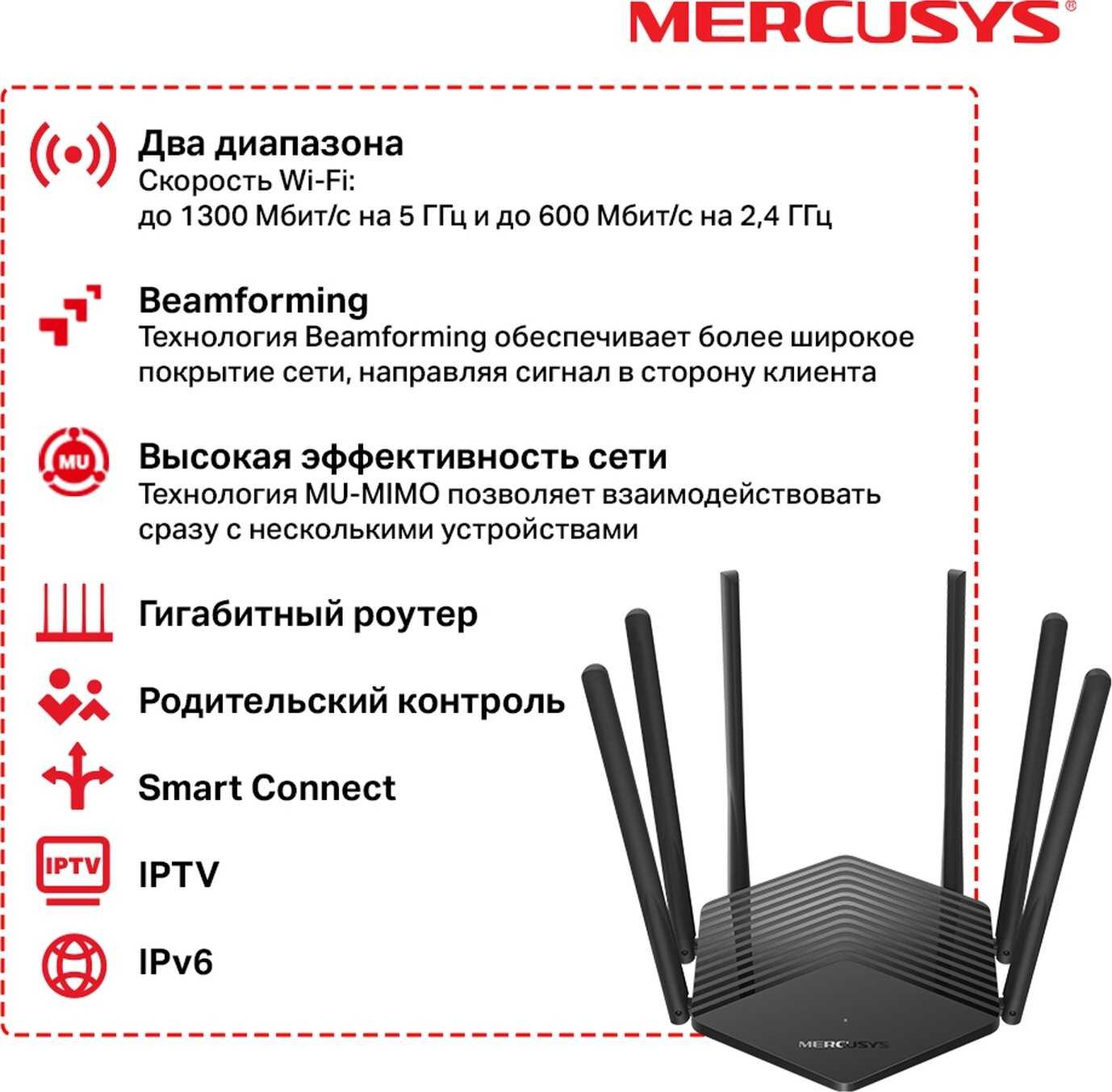 | Дополнительная информация : | комплектация: двухдиапазонный гигабитный Wi-Fi роутер (MR50G), адаптер питания, кабель Ethernet, руководство по быстрой настройке |