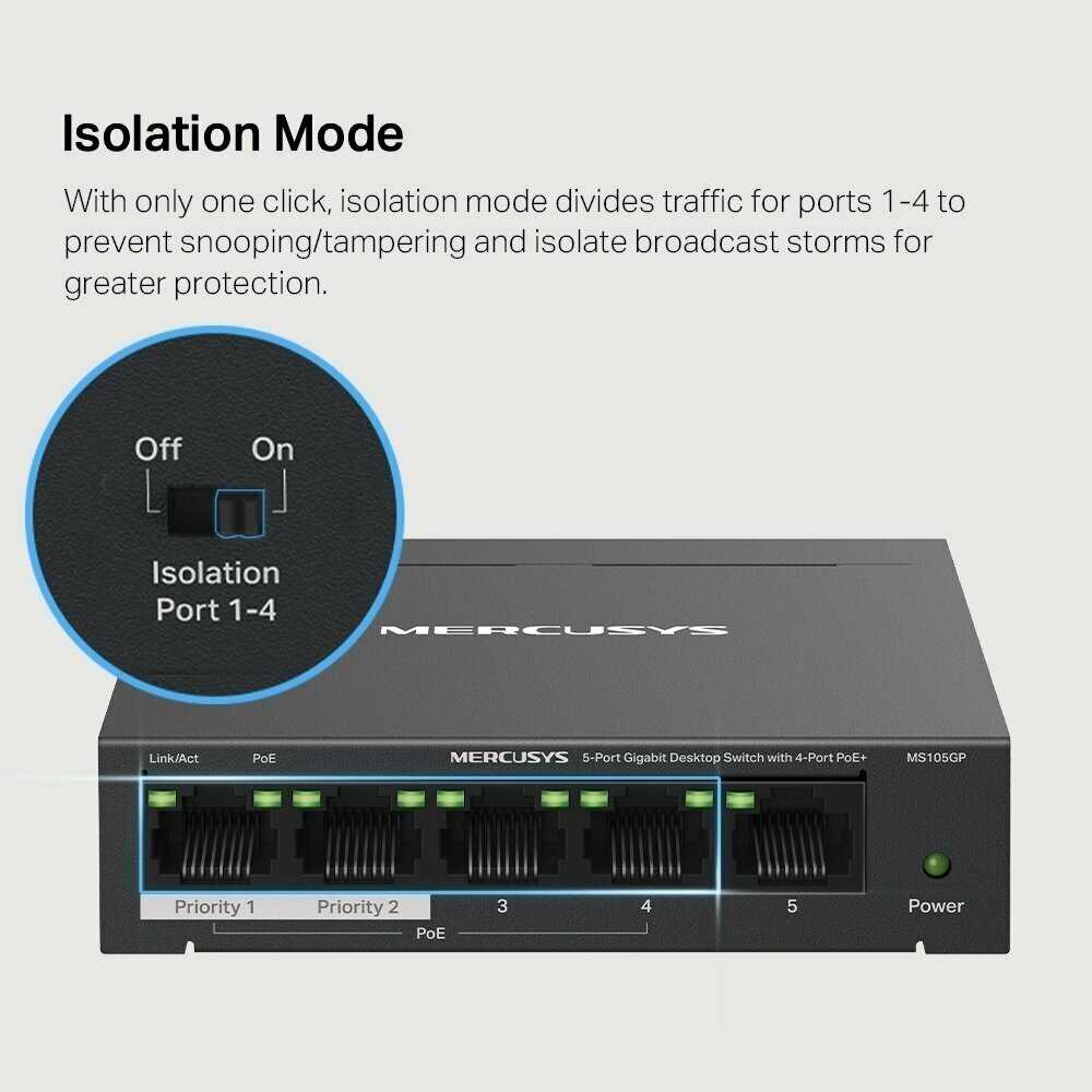 Отзывы о Настольный коммутатор Mercusys MS105GP [5 гигабитных портов, 4 PoE+]