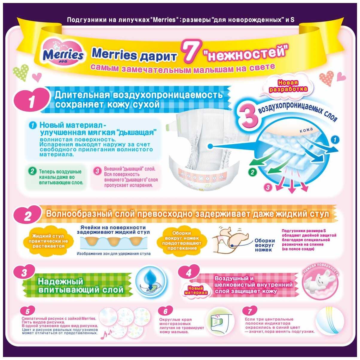 Подгузники Merries — это премиальное решение для родителей, prioritetом которых является здоровье кожи новорожденного. Их ключевое преимущество — гипоаллергенность, подтвержденная многолетним опытом использования: даже дети с атопическим дерматитом и недоношенные редко сталкиваются с раздражениями. Технология трехслойного дышащего материала обеспечивает циркуляцию воздуха, что критично для профилактики опрелостей в жарком климате. Однако эффективность этой системы снижается зимой: внешний слой недостаточно изолирует холод, что требует тщательного подбора одежды.