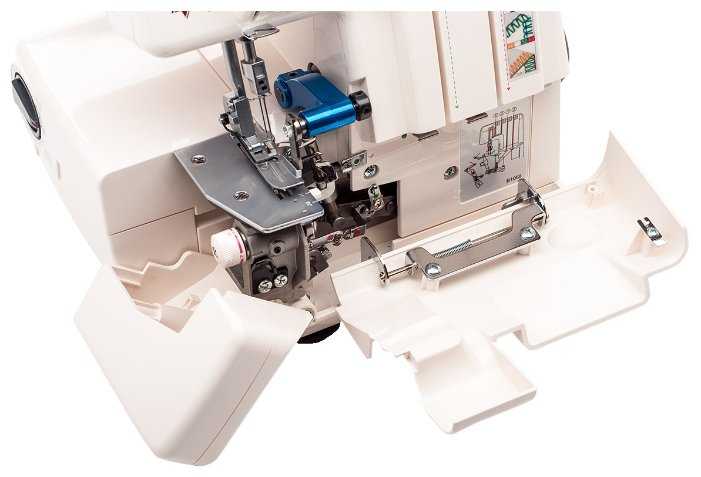 Не прихотлива к тканям, хороший механизм подачи ткани, есть подробная инструкция по заправке и настройке, в наборе есть запасные иглы, машинное масло, пинцет, отвертки, запасной нож, зажимы для катушек, щеточка для чистки и лоток для обрезков.