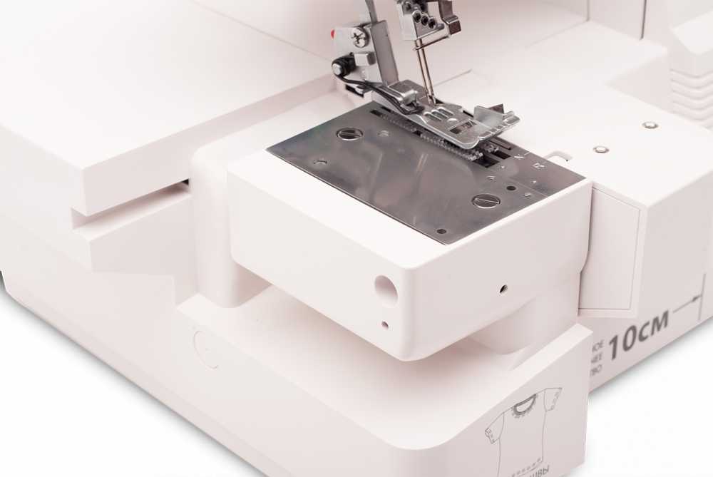 Аппарат совмещает функции оверлока и распошивальной машины, позволяя выполнять 14+ типов строчек, включая плоский шов для трикотажа и декоративные операции. Переключение между режимами занимает от 5 минут у опытных пользователей, хотя новички сообщают о сложностях при перенастройке на плоскошовное шитьё. Система цветной маркировки нитеводов ускоряет заправку, а съёмная рукавная платформа расширяет возможности обработки манжет и узких деталей. "Свободный рукав" успешно применяется для циклического шитья мелких элементов, но требует практики для избежания перекоса ткани. Подсветка рабочей зоны светодиодом обеспечивает видимость при работе с тёмными материалами, хотя острота краёв игольной пластины может повреждать деликатные ткани типа бифлекса без дополнительной шлифовки.