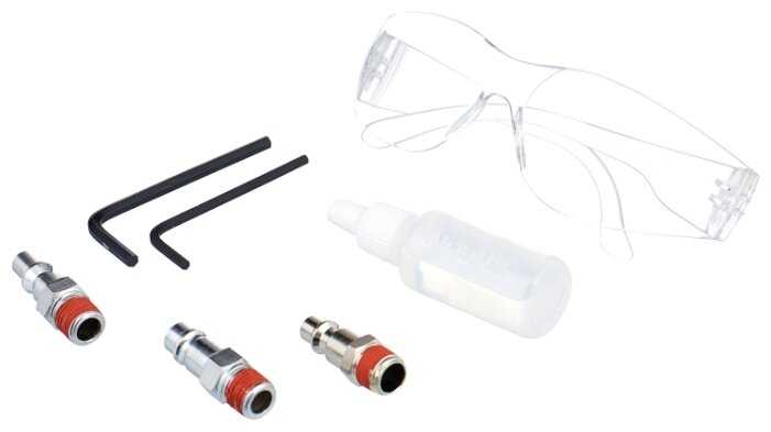 В комплект поставки входят защитные очки и 2 пневматические разъемы. К сожалению, нет гвоздей или скоб при этом, я считаю, что, в свою очередь, жаль, потому что для Пробы было бы очень хорошо, если бы можно было протестировать разные ногти / скобы, ибо тот, кто покупает уже без опыта эти вещи равны в 100ten шт пачки?