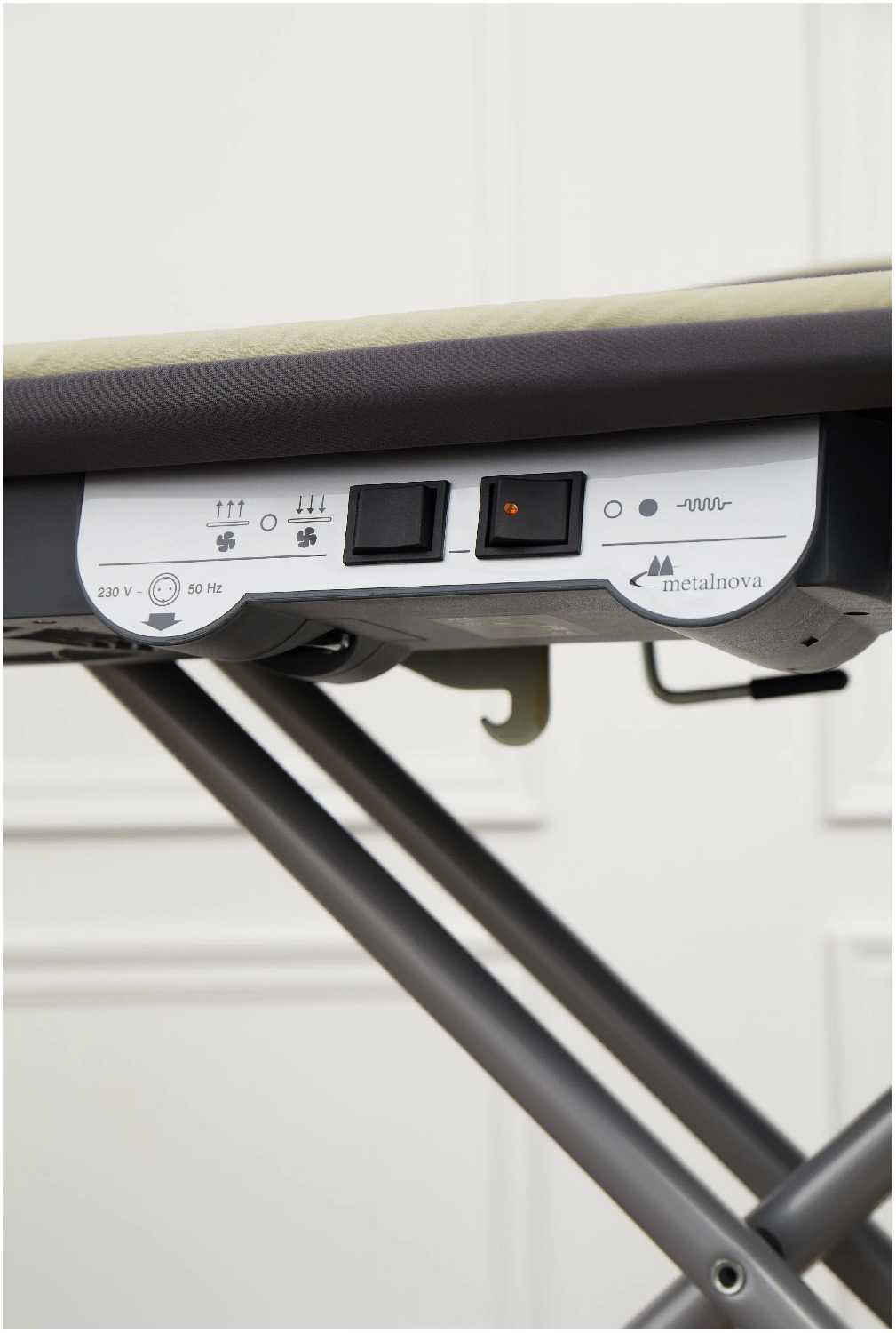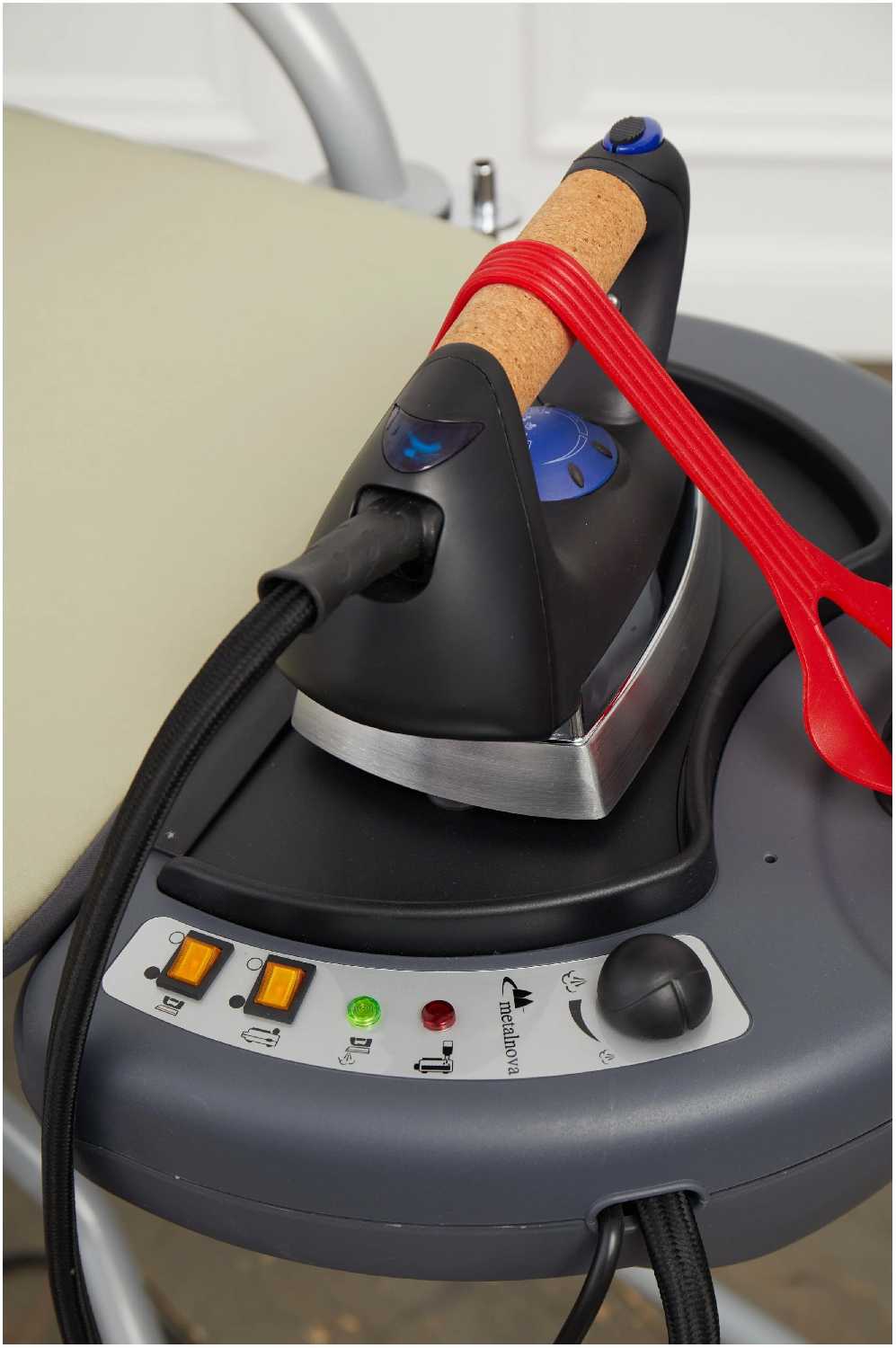 встроенная розетка, индикация уровня воды, складная конструкция, держатель парового шланга, индикация готовности к работе, колесики, регулировка высоты доски, рукавная платформа