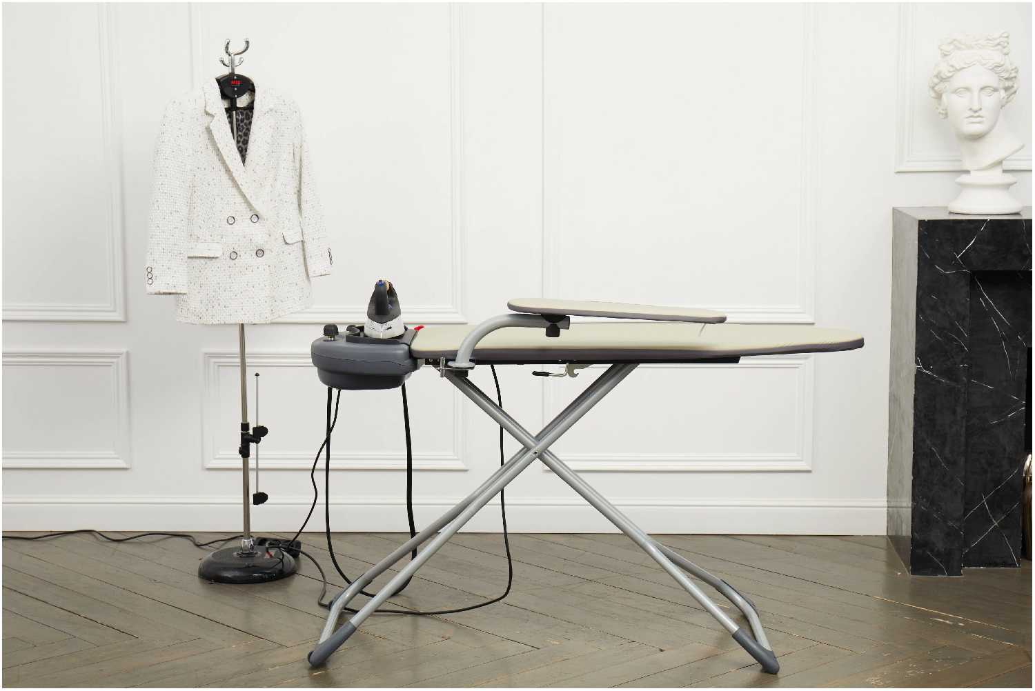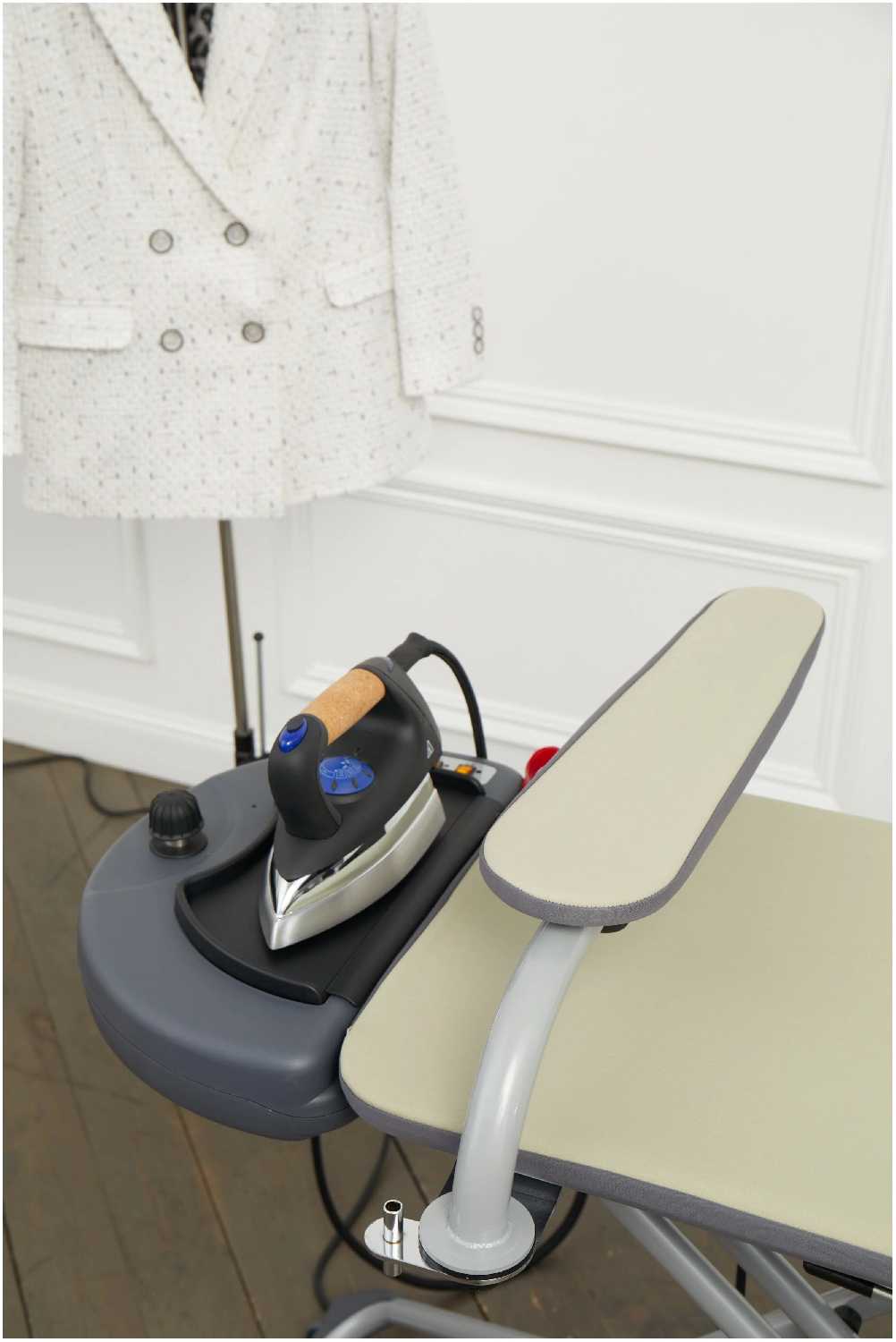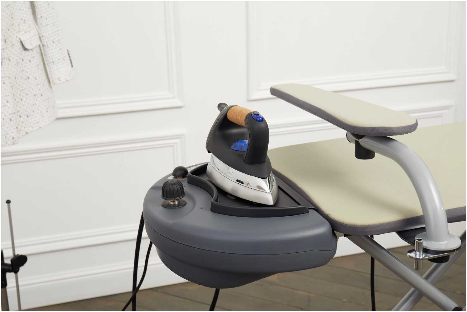 возможность сухой глажки, складная система, встроенная розетка, чехол для гладильной доски, регулировка по высоте