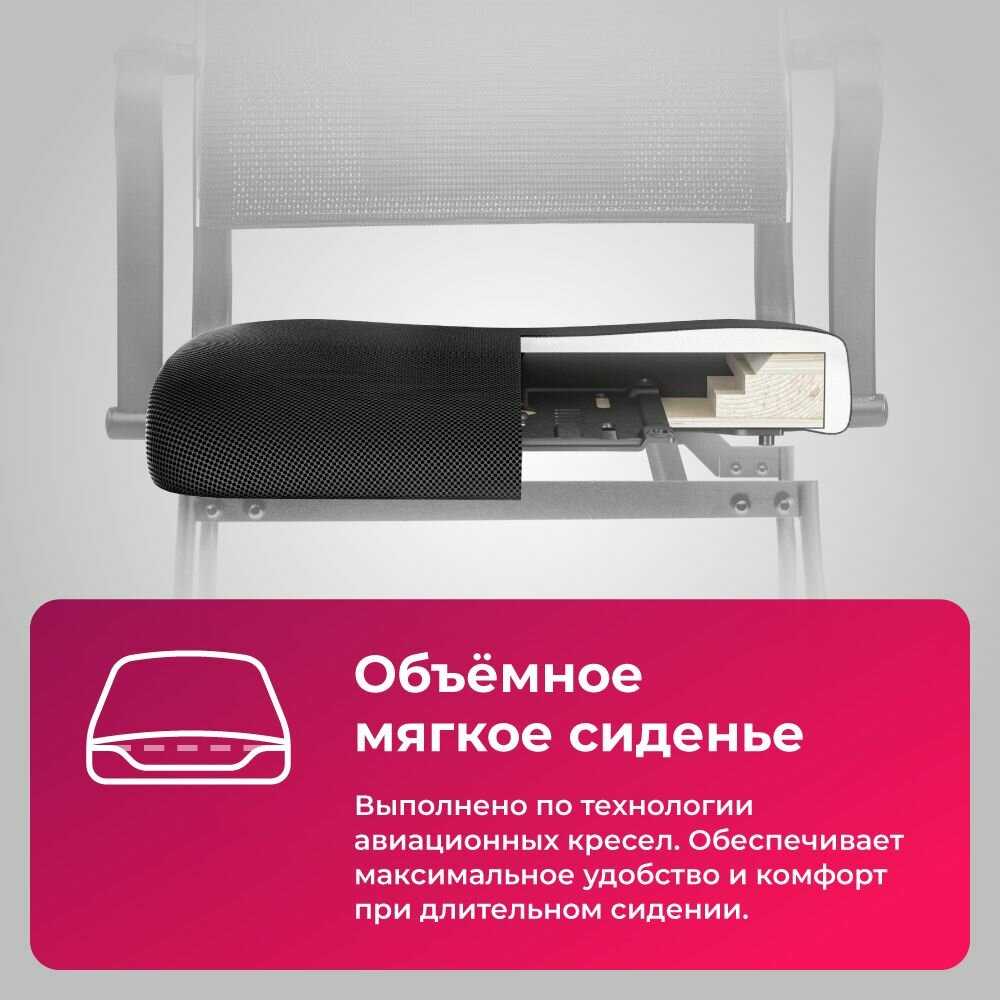 - + 1) Удобная сидушка и анатомическая сетчатая спинка - тело не устаёт и не потеет;