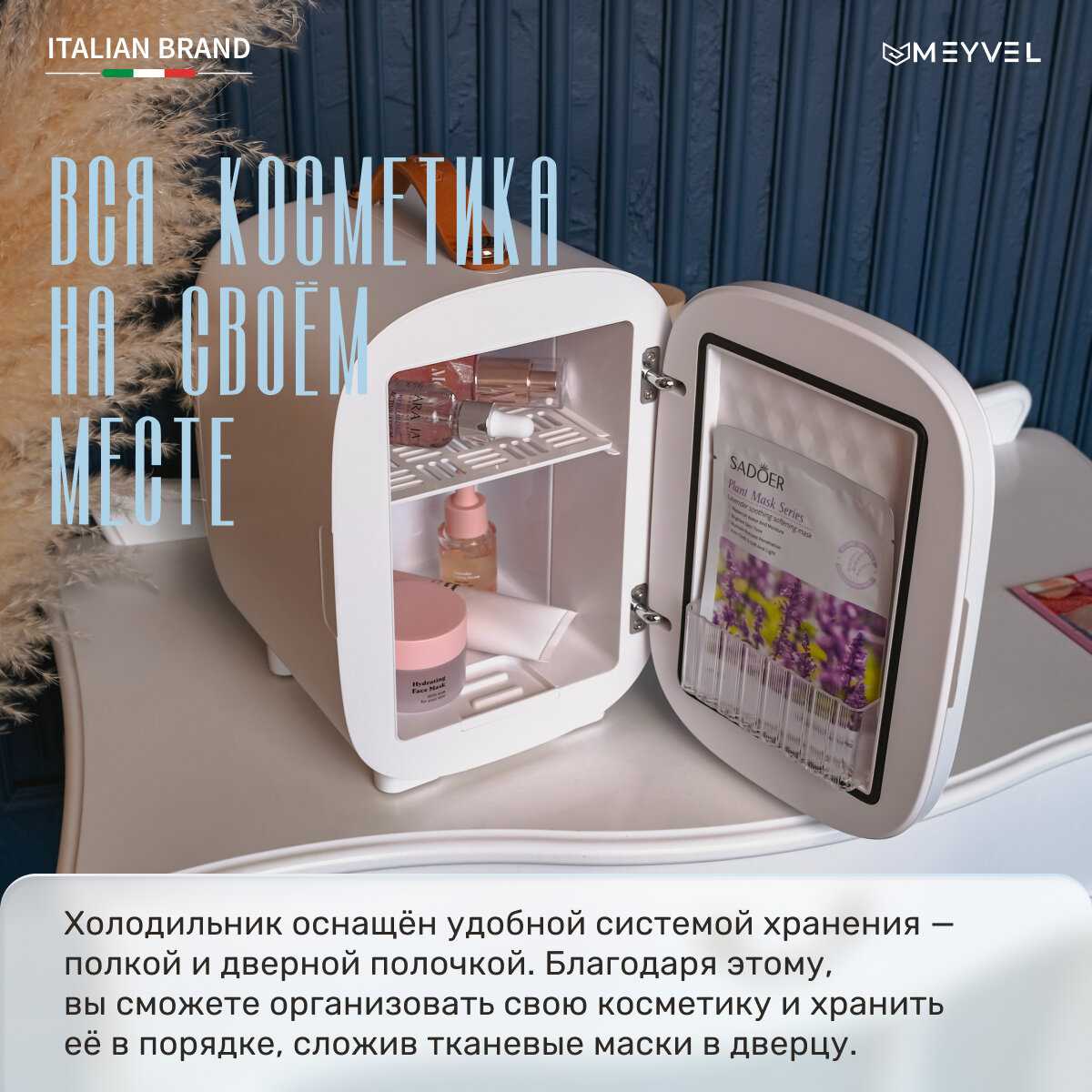 - Вмещает несколько масок, патчей, кремов, баночек сывороток и гидрогелевых масок на дверце (3–4 шт.).