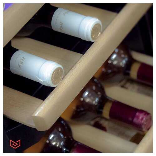 Полки деревянные, выдвижные, удобны для хранения, но некоторые пользователи называют их хлипкими под весом бутылок. В одном отзыве упомянуты слишком короткие полки, из-за чего бутылки не влезли. Подсветка иногда отсоединена на заводе. В целом, для 12 бутылок держатся стабильно.