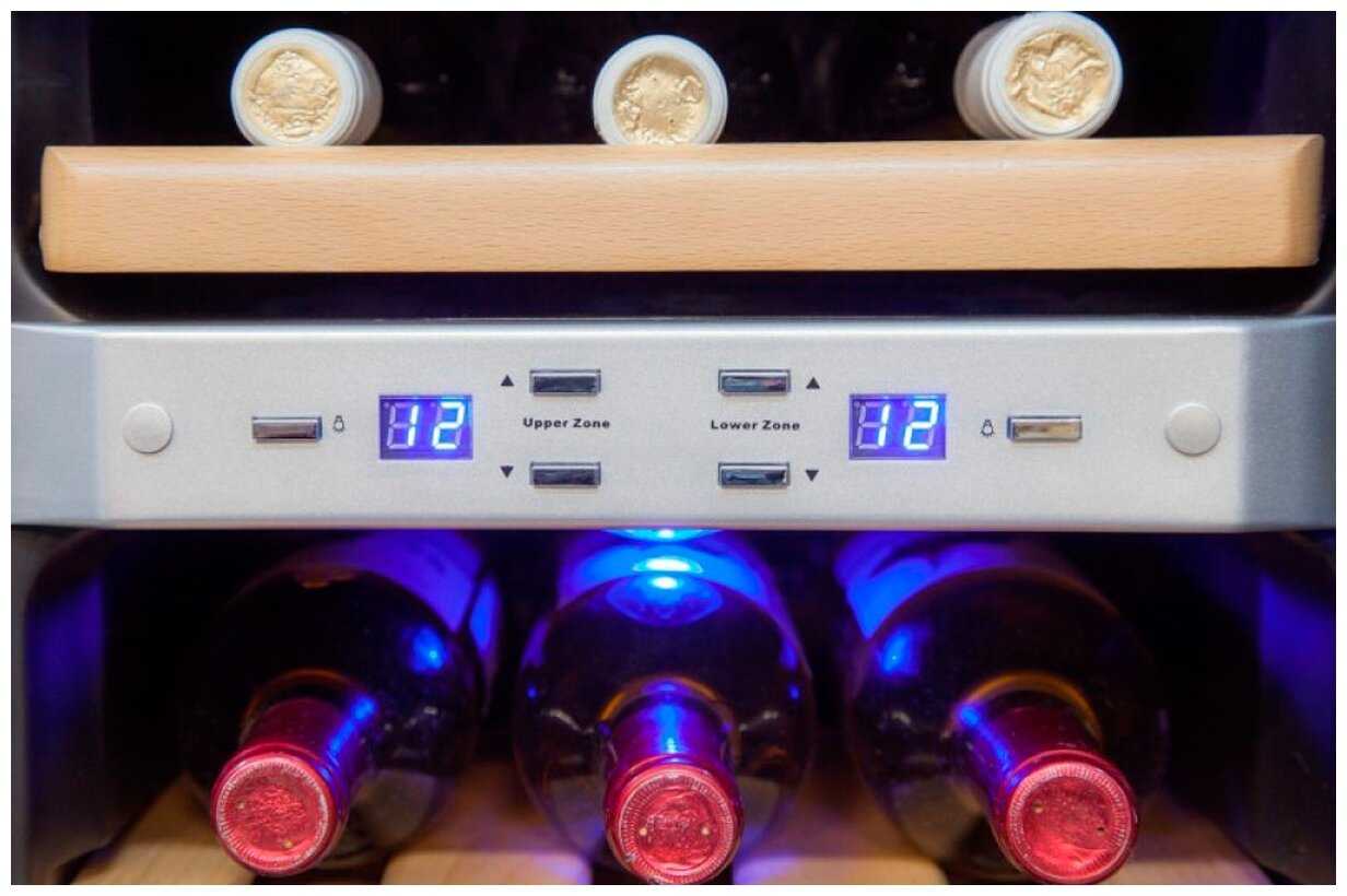 Две зоны охлаждают равномерно, позволяя хранить красное вино при 13 градусах и белое при 7, без смешивания температур. Пользователи отмечают, что после установки температура стабилизируется быстро, сохраняя вкус напитков. Однако в случае поломки верхняя зона может нагреваться, нарушая баланс. Для малого объема это работает хорошо, без перепадов внутри.