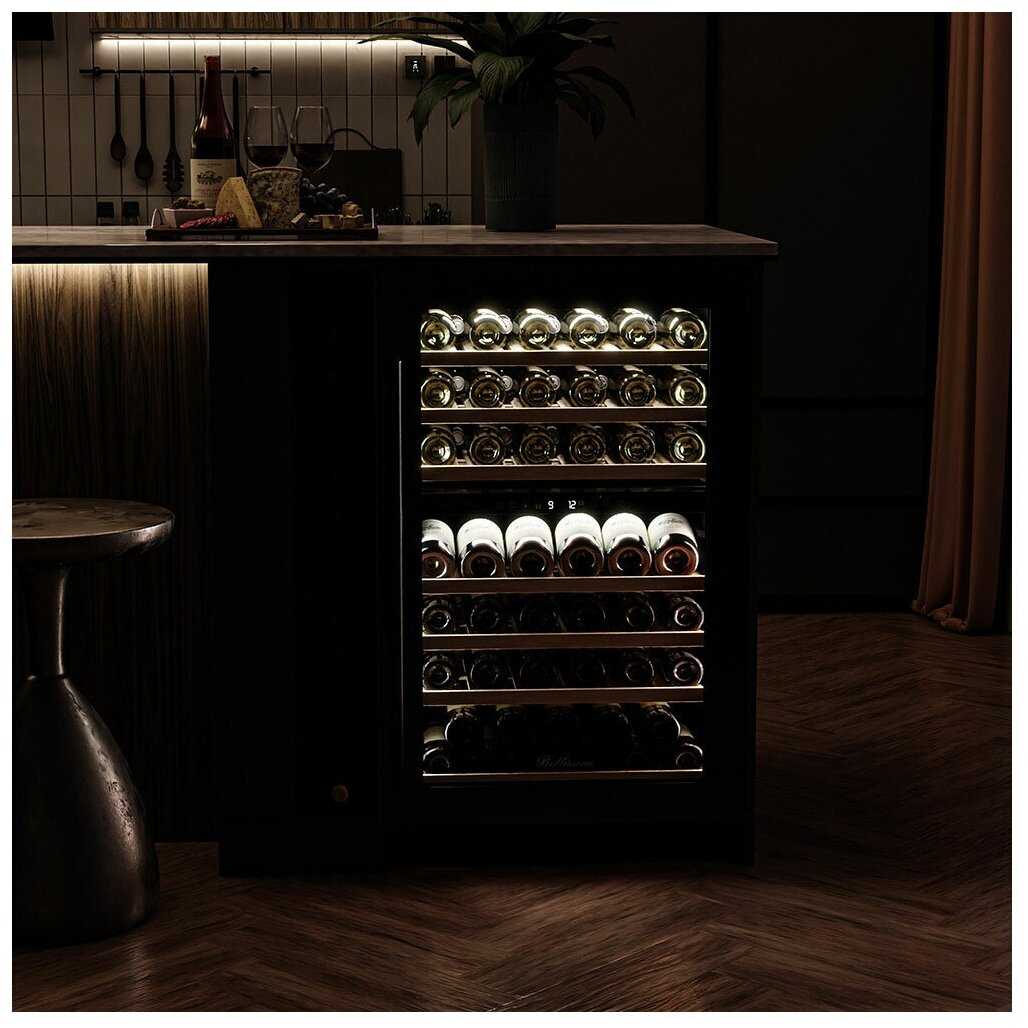 Отлично вмонтировался в мебель, шесть полок позволяют разместить много бутылок с вином, регулировка температуры на две зоны, когда дверь не закрыли, срабатывает датчик. Есть два вида освещения, постоянное и когда клиент хочет посмотреть. Качественные фильтры запахов внутри нет. Энергии берет мало.