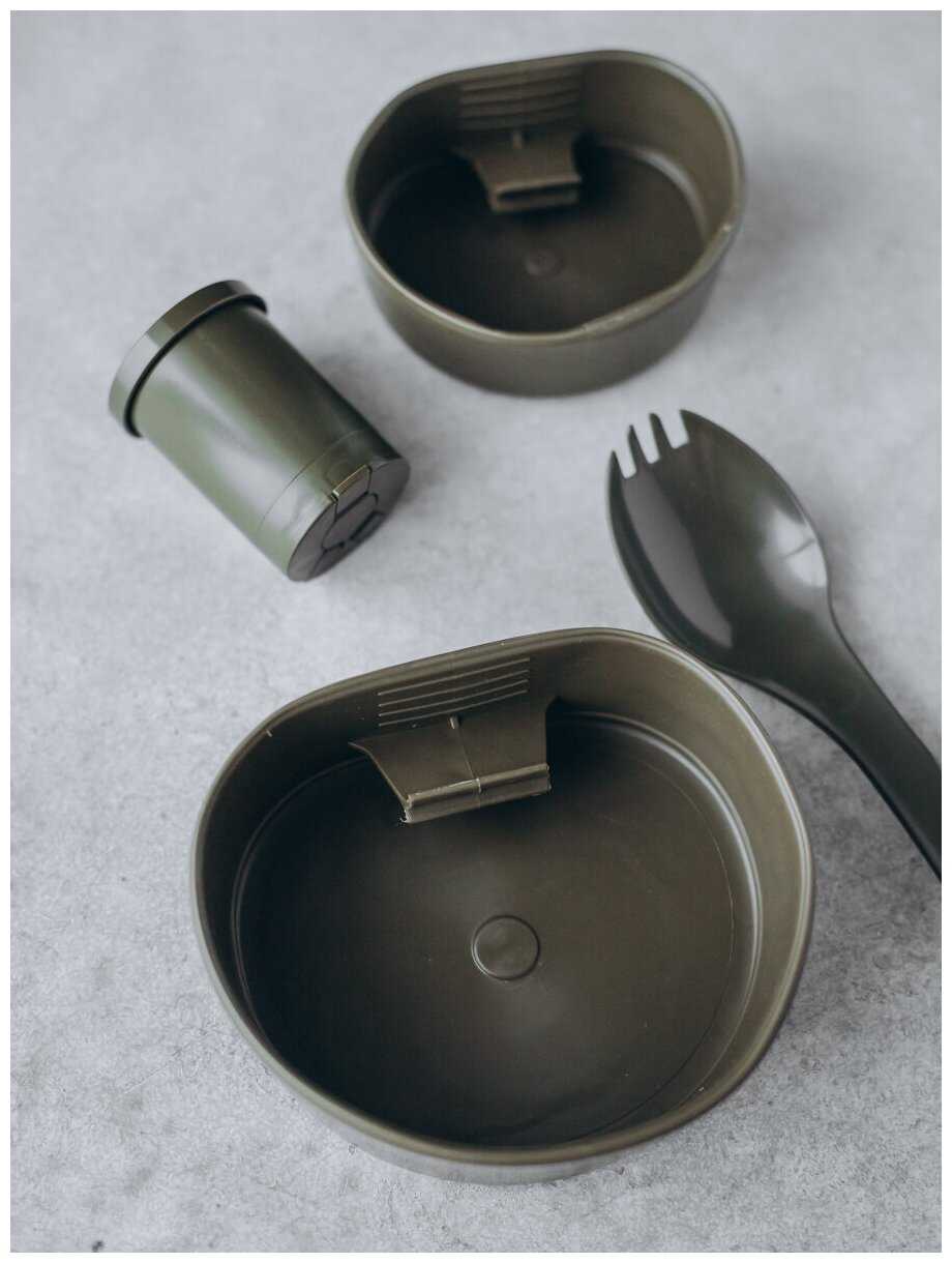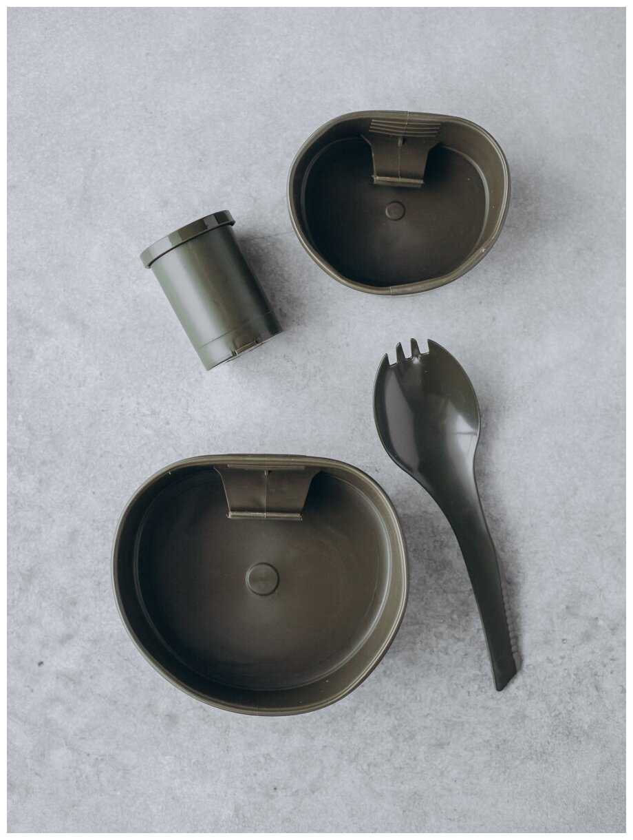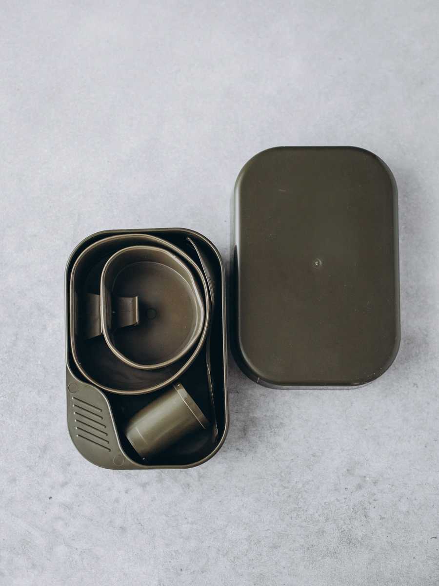 - + Все для приема пищи в наличии. Кружка и миска чуть больше, чем их обычные прототипы и выполнены из более мягкой пластмассы. Чехол прочный и позволяет носить набор с внешней стороны рюкзака, обеспечивая быстрый доступ к набору.