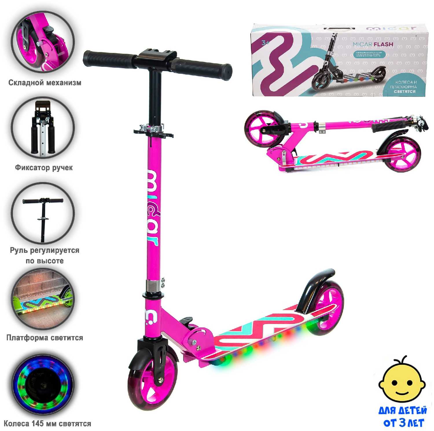 - + Самокат красивый подсветка яркая колеса тоже клевые светятся для девочек самое то очень интересный самокат