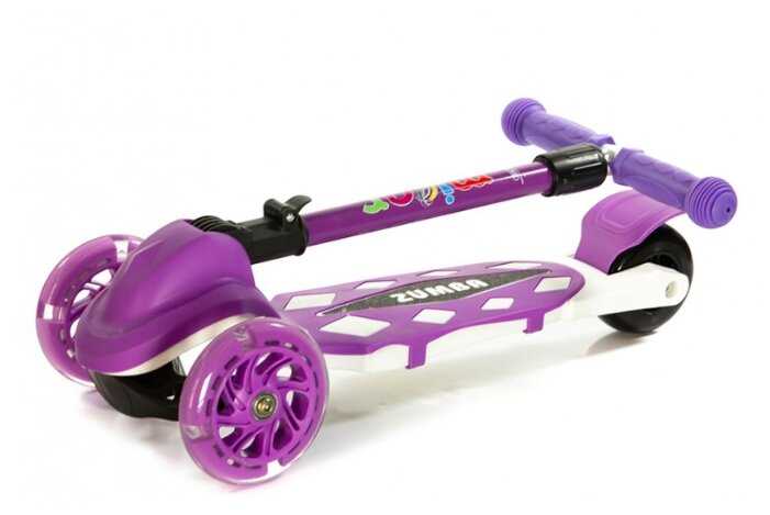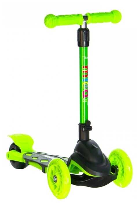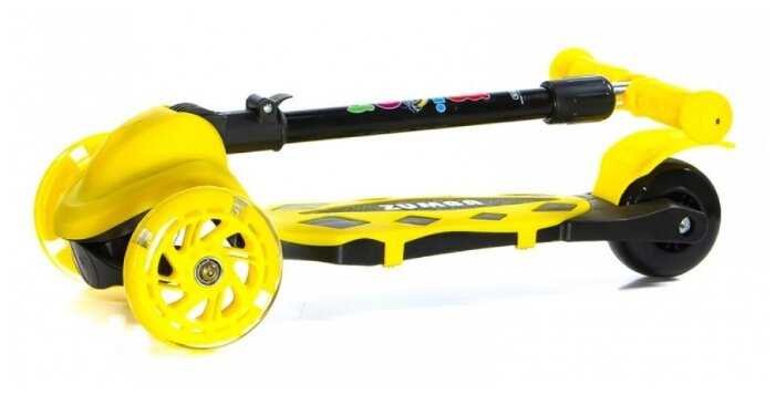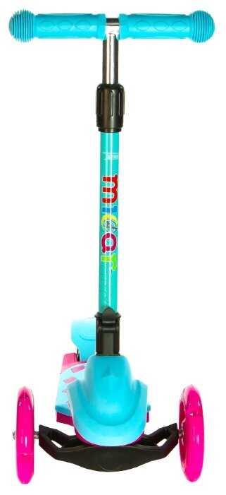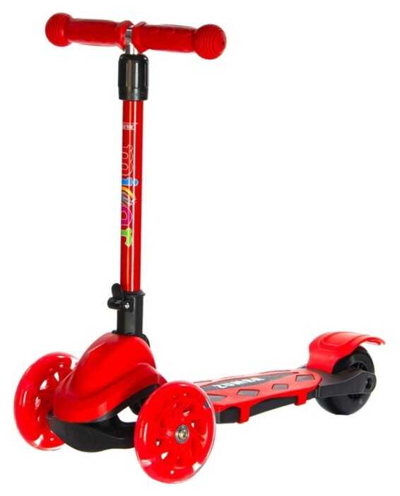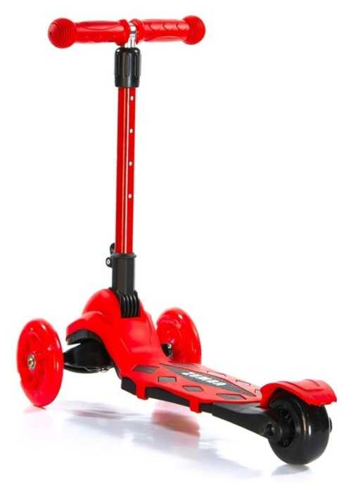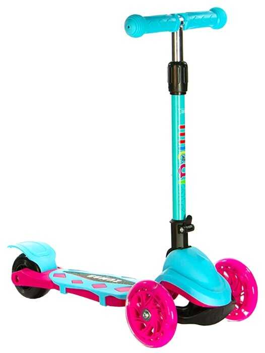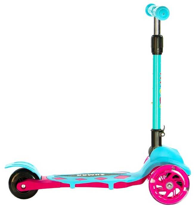 Яркий цвет, широкая доска под ноги, колеса светятся при езде, поворачивается от наклона, поэтому совсем маленьким деткам осторожно, ручка регулируется по высоте.