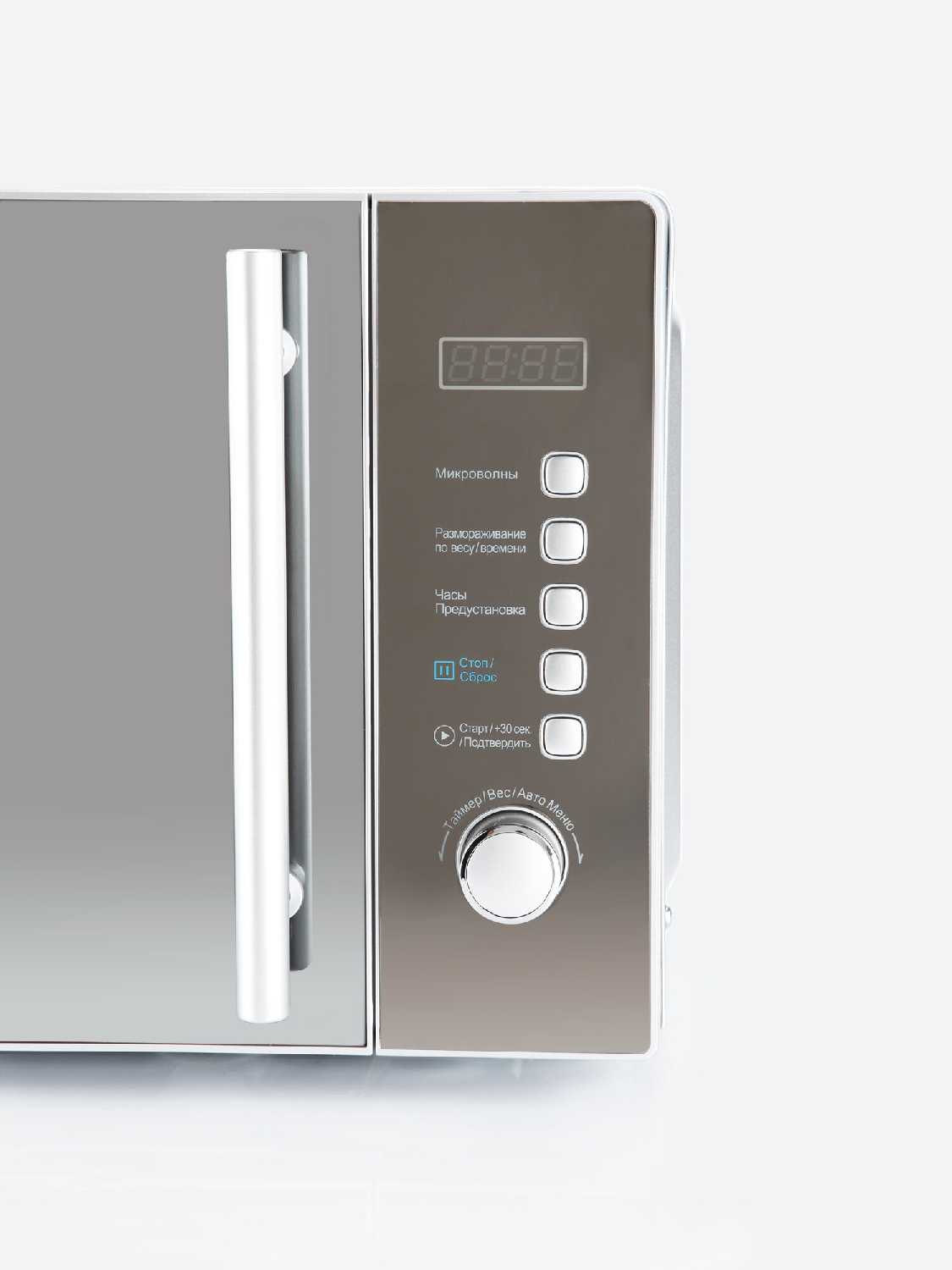 Гибридное управление сочетает кнопку быстрого старта (добавляет по 30 секунд) и поворотное колесо для точной настройки времени. Однако направление вращения ручки вызывает вопросы: против часовой стрелки активируются программы, а по часовой — отсчет времени начинается с 95 минут, что неинтуитивно для частого выставления коротких интервалов (например, 10–120 секунд). Пользователи отмечают, что для разогрева проще использовать кнопку, а ручку — для сложных задач. -