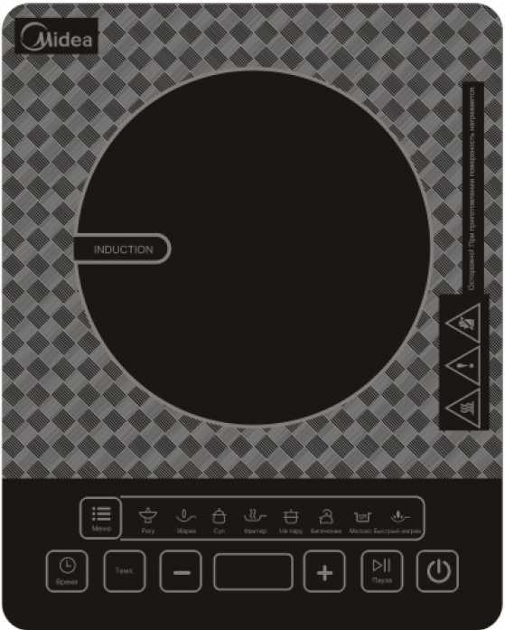 - Автоматическое отключение при переливе жидкости или отсутствии посуды предотвращает перегрев.
