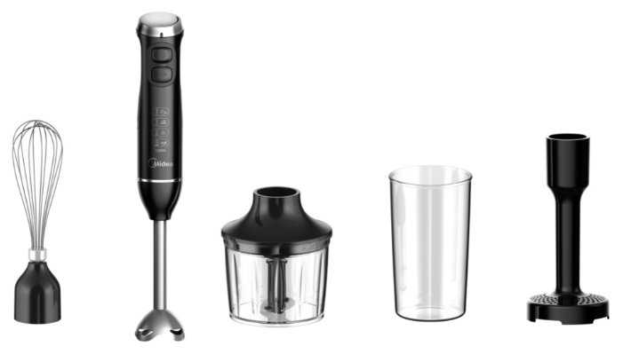 - Металлическая нога-блендер, венчик для взбивания (воздушные омлеты, кремы, тесто), толкушка для пюре, измельчитель с чашей 400 мл.
