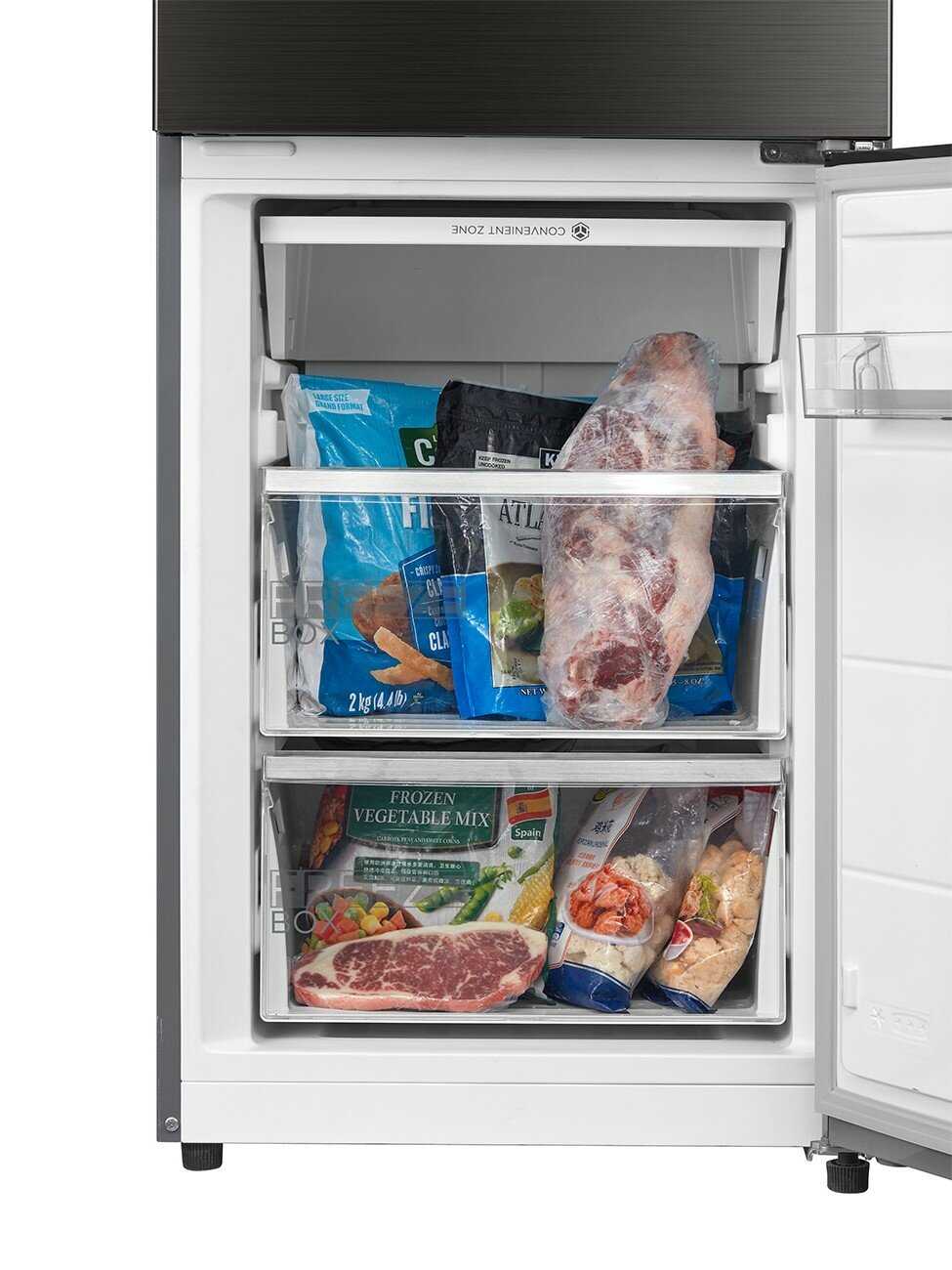 - Наличие специальных зон: «нулевая камера» для мяса и рыбы, а также зона свежести с контролем влажности для фруктов и овощей, что оптимизирует условия хранения для разных типов продуктов.