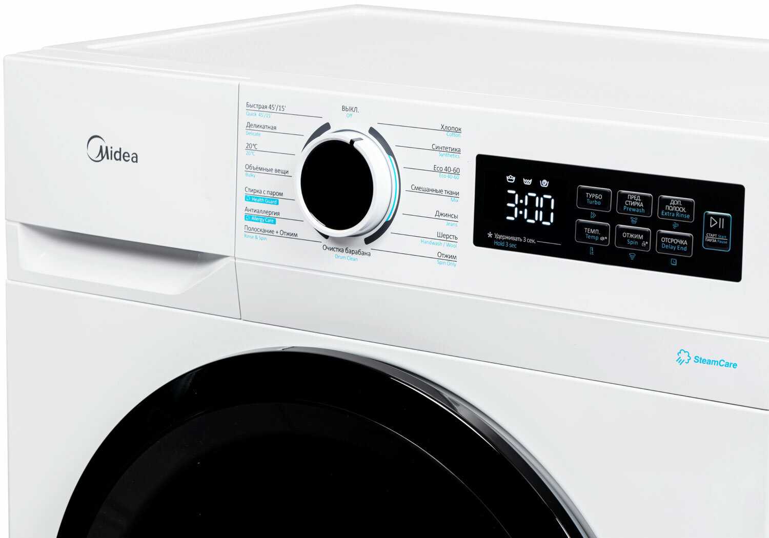 15-16 программ включают антиаллергию с паром, для джинсов, пуховиков, объемных вещей, быструю 15 мин и очистку барабана. Пар подается во время стирки, помогает аллергикам и после стирки собачьих вещей. Отсрочка старта удобна для ночного или утреннего запуска. Турбо сокращает время вдвое, например хлопок с 3 ч до 1,5 ч. -