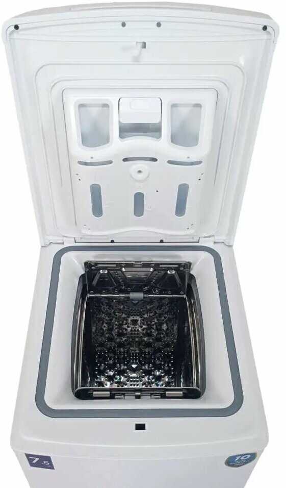 - Верхняя загрузка экономит пространство: машинка легко встраивается в маленькие ванные комнаты или коридоры.