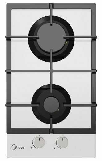 Варочная панель от Мидеа — белая, на две конфорки, с электроподжигом и чугунной решёткой. Выглядит стильно, пользоваться удобно