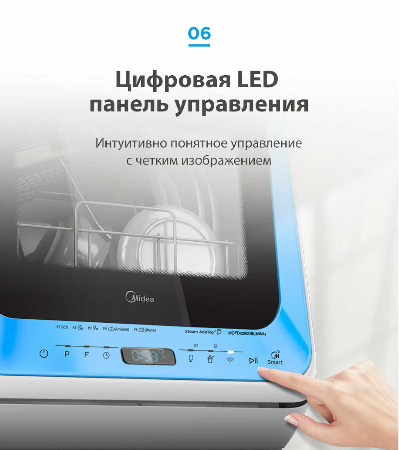 - Сенсорная панель с защитой от брызг и подсветкой упрощает управление в условиях низкой освещённости.