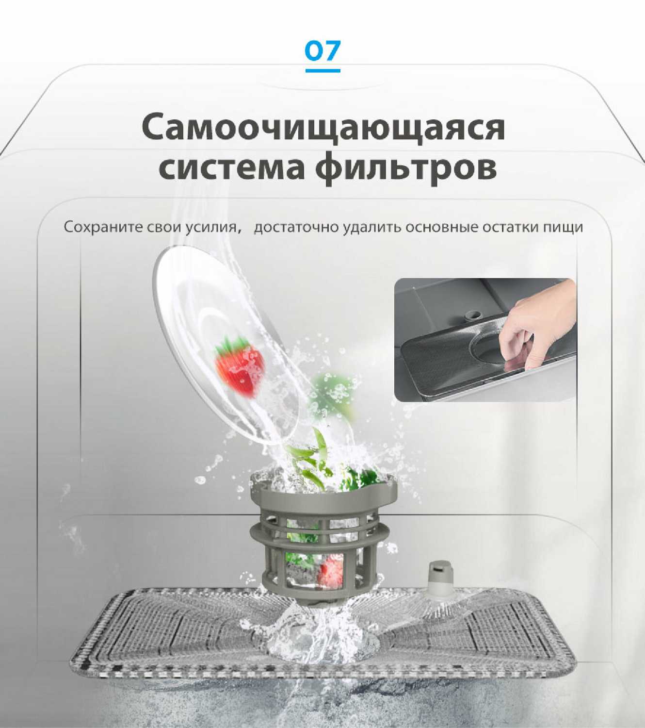 - Эффективная система мойки с тремя разбрызгивателями и отдельным лотком для столовых приборов: