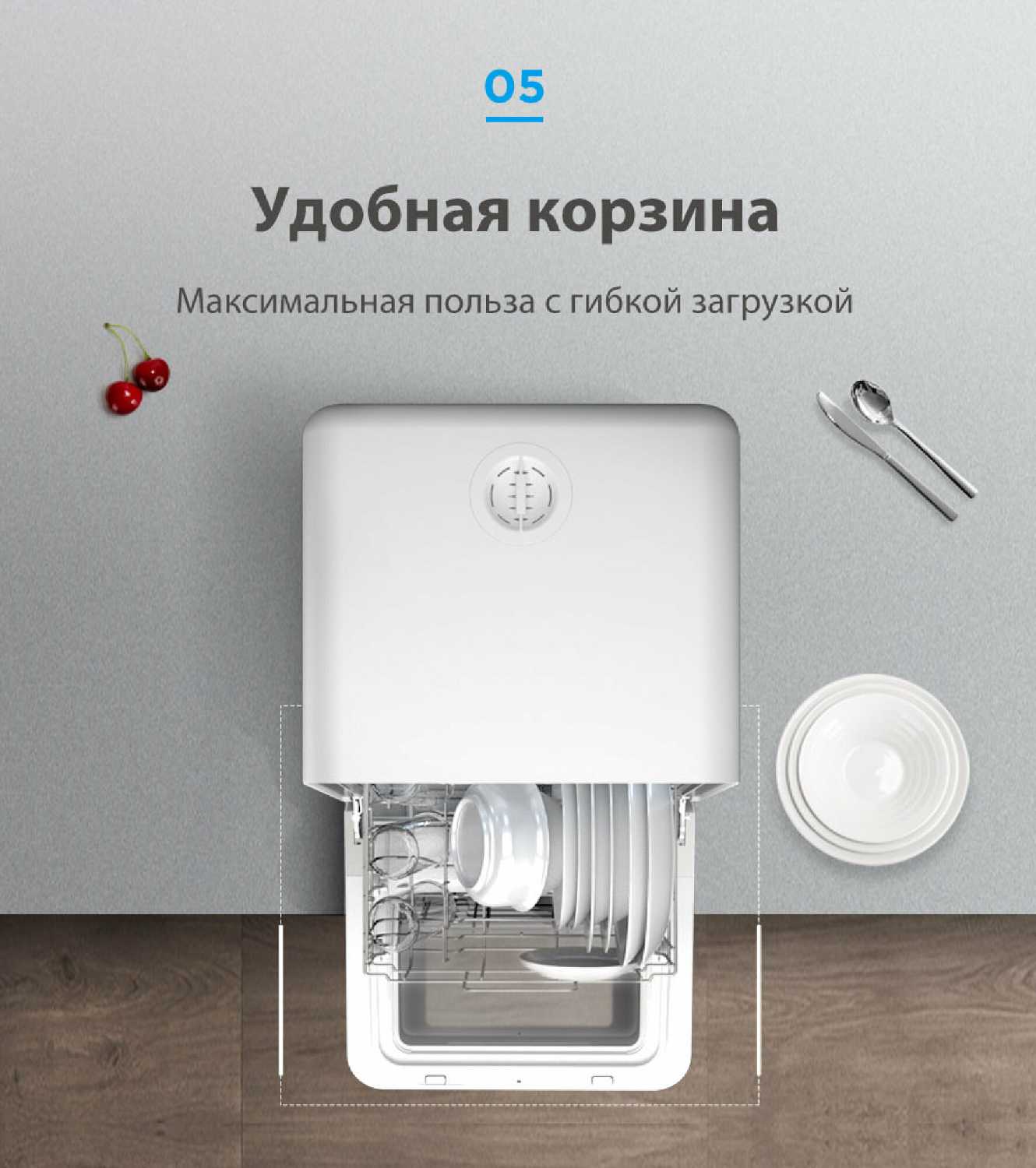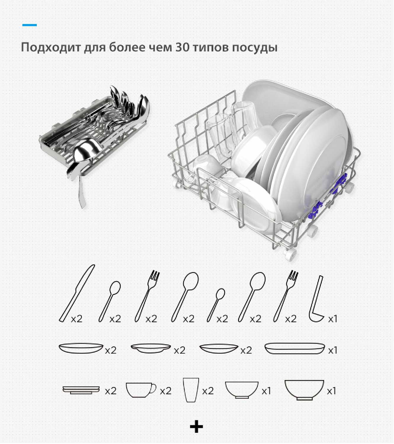 - Три корзины, включая верхний ярус для ложек, вилок и ножей, обеспечивают рациональное распределение посуды.