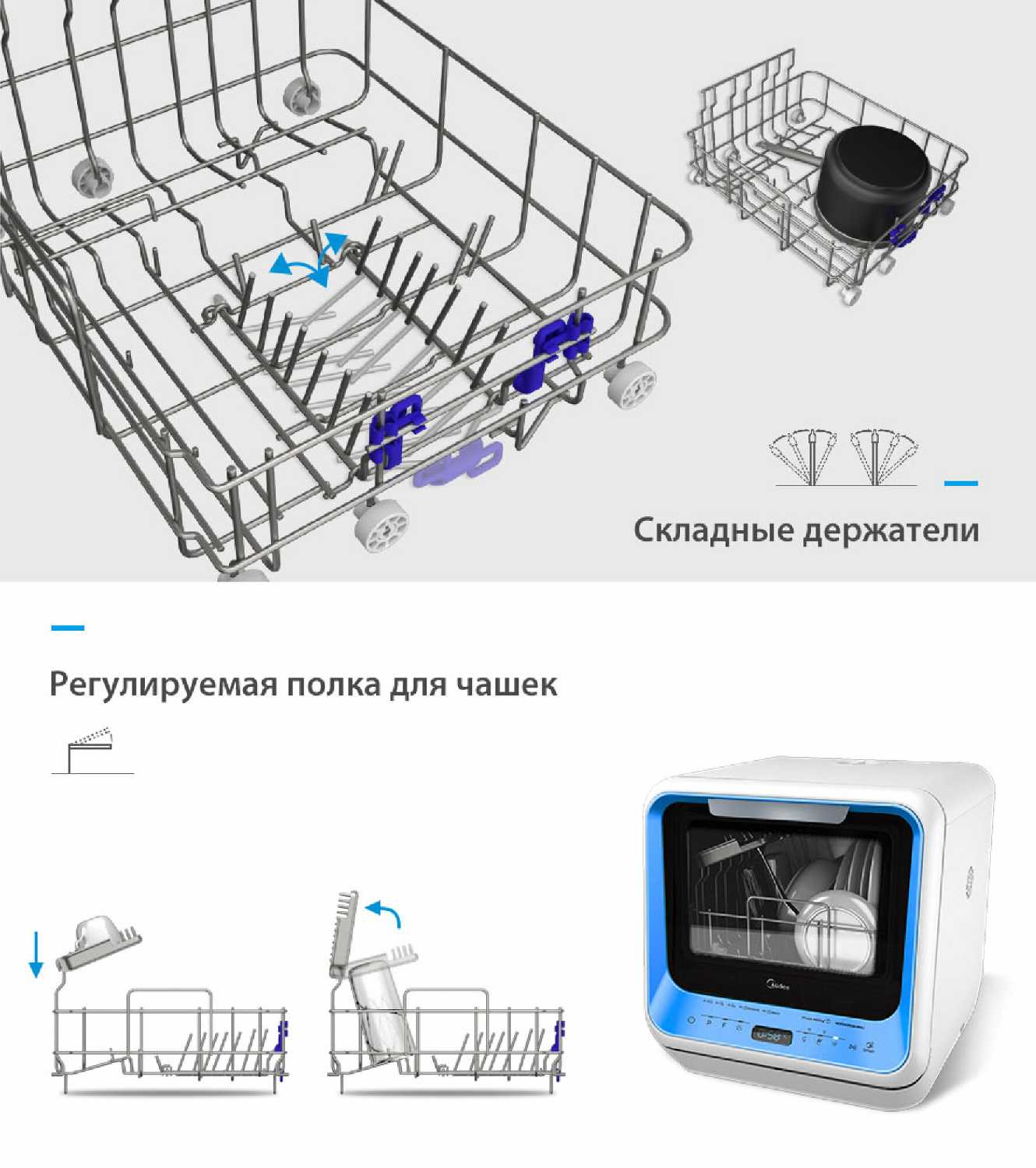 - Регулируемые полки позволяют размещать крупные предметы (казаны, сковороды) без ущерба для качества мойки.