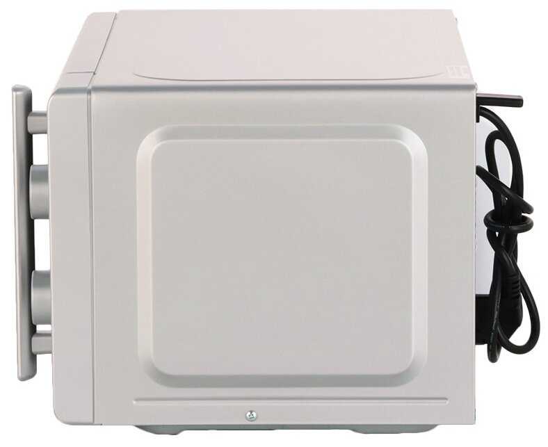 Объём камеры составляет 20 литров, диаметр поворотного столика 245 мм. Внутреннее покрытие выполнено из термостойкой эмали, которая устойчива к механическим повреждениям и высоким температурам. Дверца открывается кнопкой, что очень удобно. Управление механическое, осуществляется двумя поворотными переключателями.